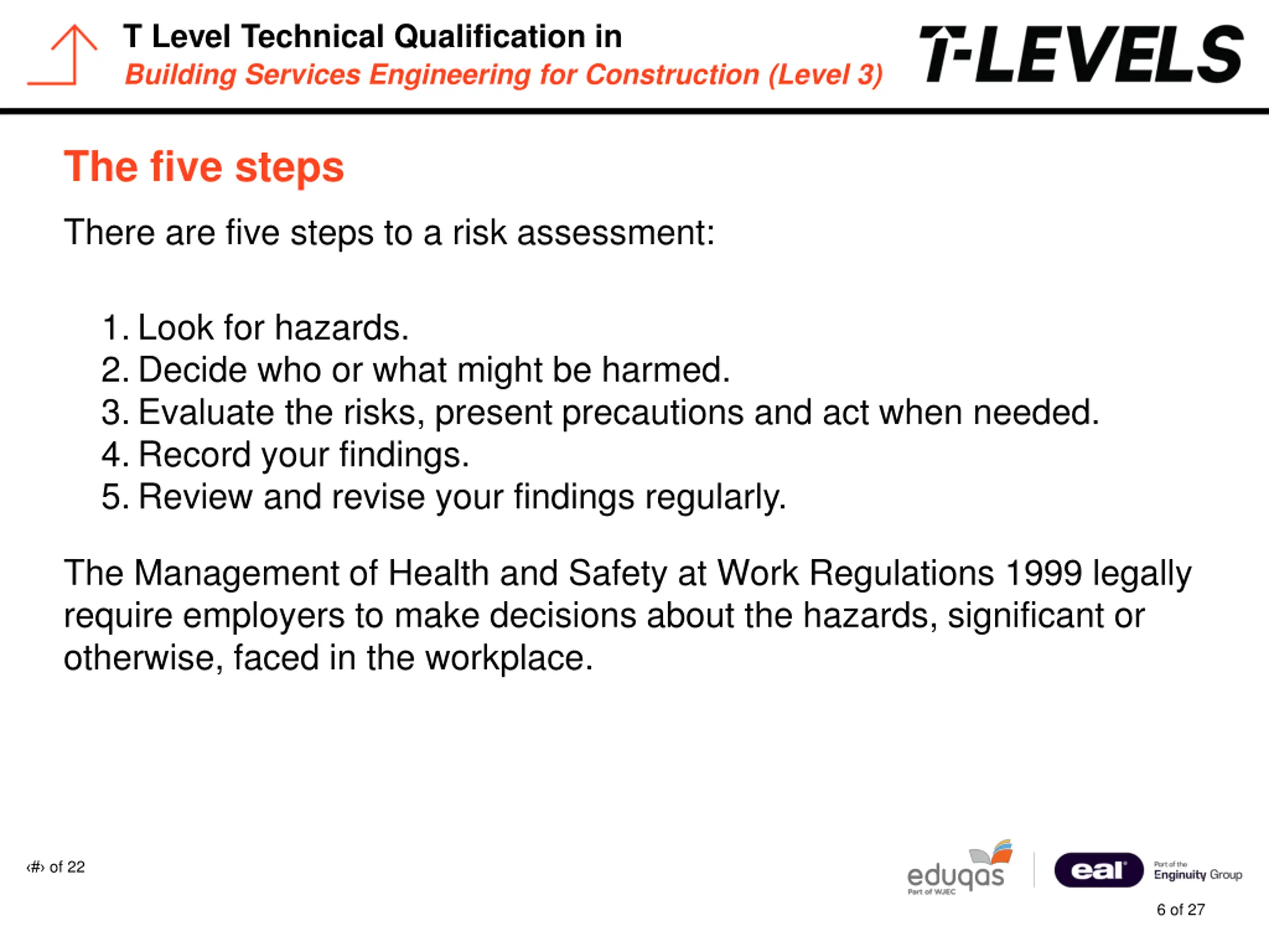 T Level Technical Qualification in Building Services Engineering for Construction (Level 3) The five steps There are five steps to a risk assessment: 1.Look for hazards. 2.Decide who or what might be harmed. 3.Evaluate the risks, present precautions and act when needed. 4.Record your findings. 5.Review and revise your findings regularly. The Management of Health and Safety at Work Regulations 1999 legally require employers to make decisions about the hazards, significant or otherwise, faced in the workplace. # of 22 6 of 27