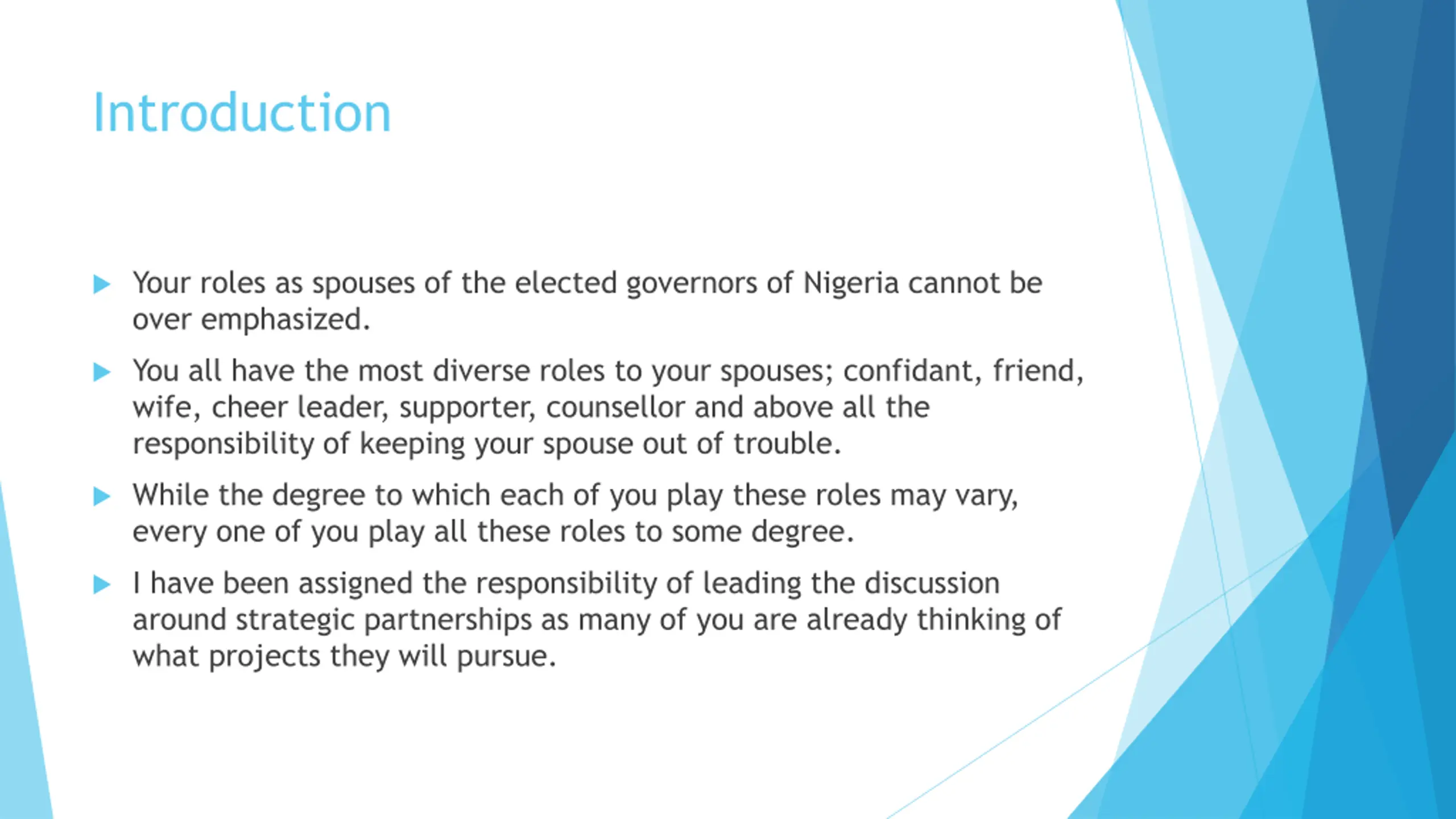 Introduction Your roles as spouses of the elected governors of Nigeria cannot be over emphasized. You all have the most diverse roles to your spouses; confidant, friend, wife, cheer leader, supporter, counsellor and above all the responsibility of keeping your spouse out of trouble. While the degree to which each of you play these roles may vary, every one of you play all these roles to some degree. I have been assigned the responsibility of leading the discussion around strategic partnerships as many of you are already thinking of what projects they will pursue.