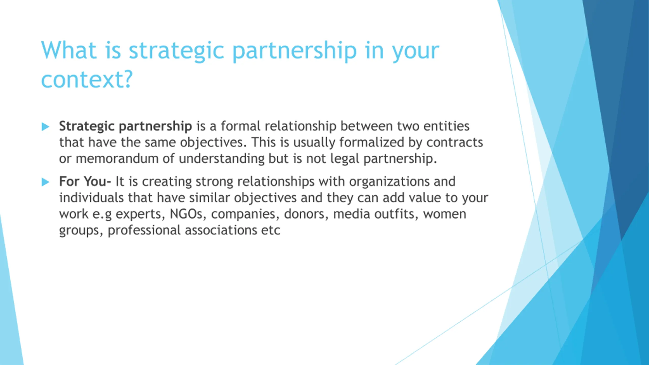 What is strategic partnership in your context? Strategic partnership is a formal relationship between two entities that have the same objectives. This is usually formalized by contracts or memorandum of understanding but is not legal partnership. For You- It is creating strong relationships with organizations and individuals that have similar objectives and they can add value to your work e.g experts, NGOs, companies, donors, media outfits, women groups, professional associations etc