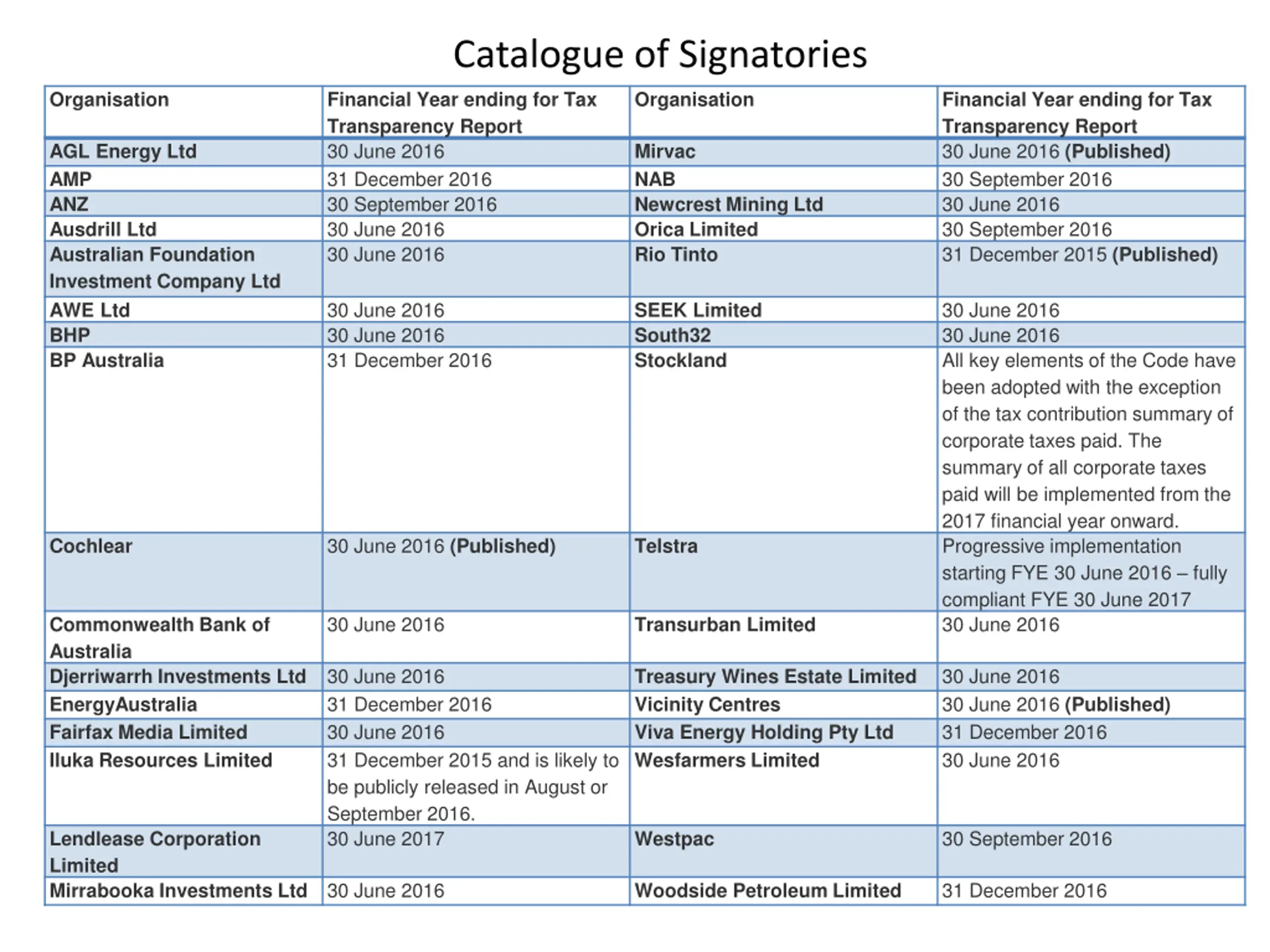 Catalogue of Signatories Organisation Financial Year ending for Tax Transparency Report 30 June 2016 31 December 2016 30 September 2016 30 June 2016 30 June 2016 Organisation Financial Year ending for Tax Transparency Report 30 June 2016 (Published) 30 September 2016 30 June 2016 30 September 2016 31 December 2015 (Published) AGL Energy Ltd AMP ANZ Ausdrill Ltd Australian Foundation Investment Company Ltd AWE Ltd BHP BP Australia Mirvac NAB Newcrest Mining Ltd Orica Limited Rio Tinto 30 June 2016 30 June 2016 31 December 2016 30 June 2016 30 June 2016 All key elements of the Code have been adopted with the exception of the tax contribution summary of corporate taxes paid. The summary of all corporate taxes paid will be implemented from the 2017 financial year onward. Progressive implementation starting FYE 30 June 2016 fully compliant FYE 30 June 2017 30 June 2016 SEEK Limited South32 Stockland 30 June 2016 (Published) Cochlear Telstra 30 June 2016 Commonwealth Bank of Australia Djerriwarrh Investments Ltd EnergyAustralia Fairfax Media Limited Iluka Resources Limited Transurban Limited 30 June 2016 31 December 2016 30 June 2016 31 December 2015 and is likely to be publicly released in August or September 2016. 30 June 2017 30 June 2016 30 June 2016 (Published) 31 December 2016 30 June 2016 Treasury Wines Estate Limited Vicinity Centres Viva Energy Holding Pty Ltd Wesfarmers Limited 30 September 2016 Lendlease Corporation Limited Mirrabooka Investments Ltd Westpac 30 June 2016 31 December 2016 Woodside Petroleum Limited