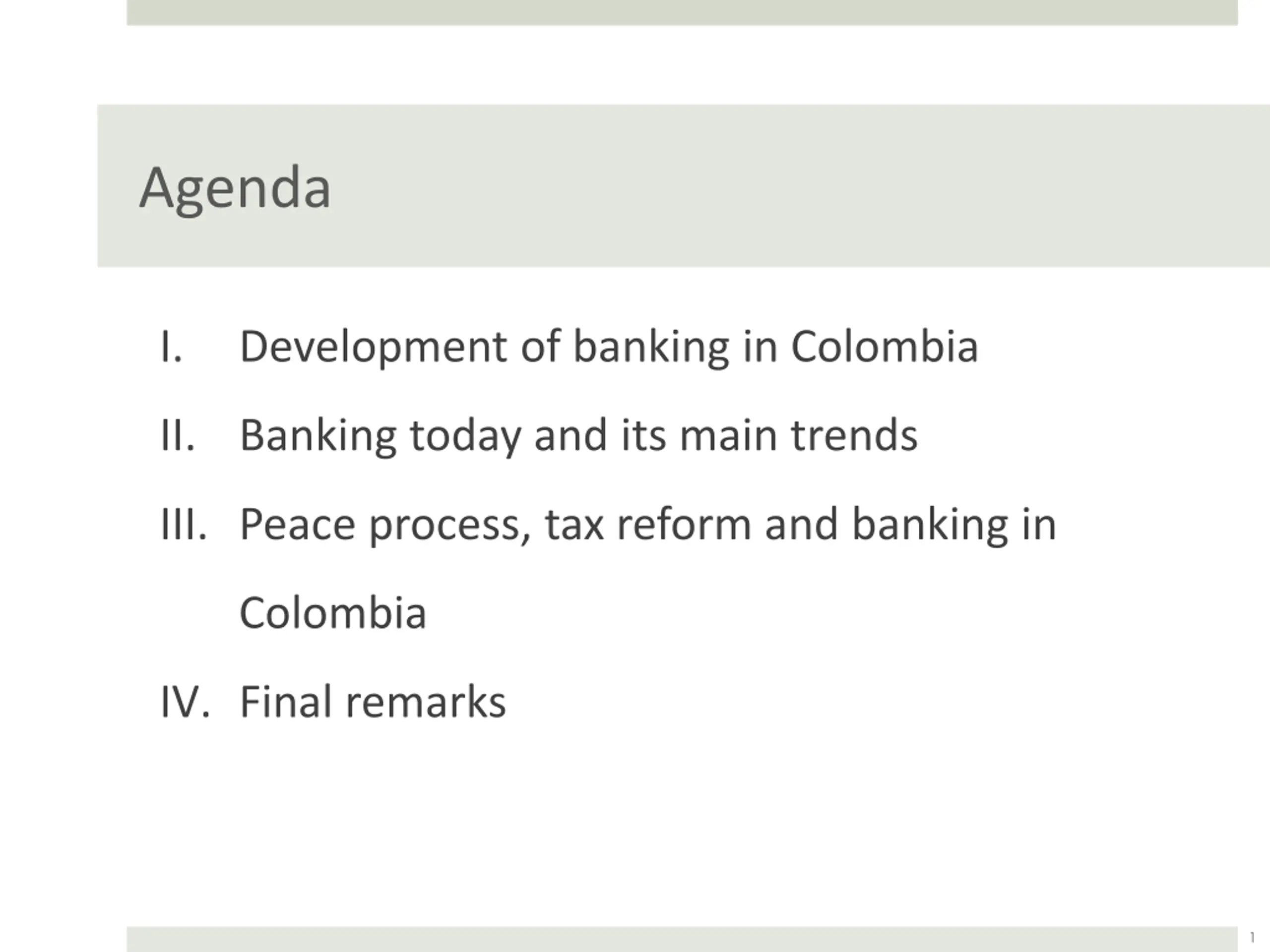 Agenda I. Development of banking in Colombia II. Banking today and its main trends III. Peace process, tax reform and banking in Colombia IV. Final remarks 1