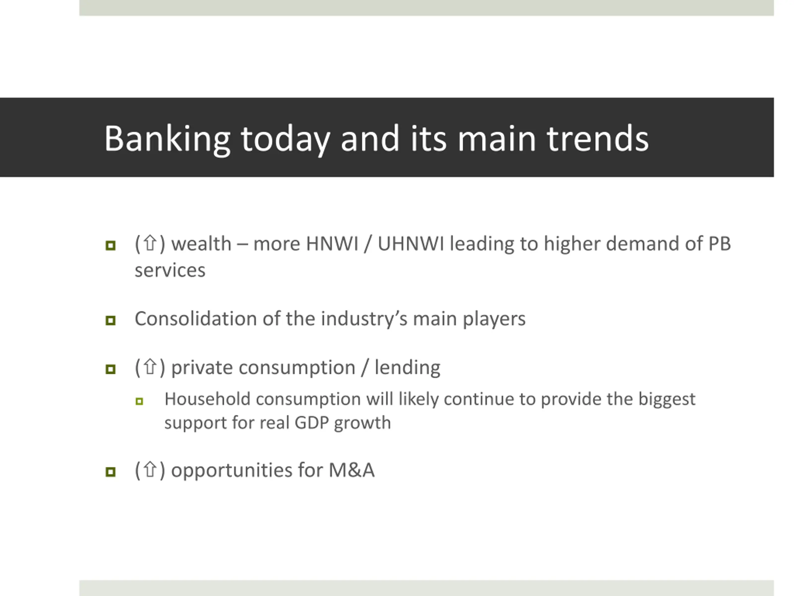 Banking today and its main trends ( ) wealth more HNWI / UHNWI leading to higher demand of PB services Consolidation of the industry s main players ( ) private consumption / lending Household consumption will likely continue to provide the biggest support for real GDP growth ( ) opportunities for M&A