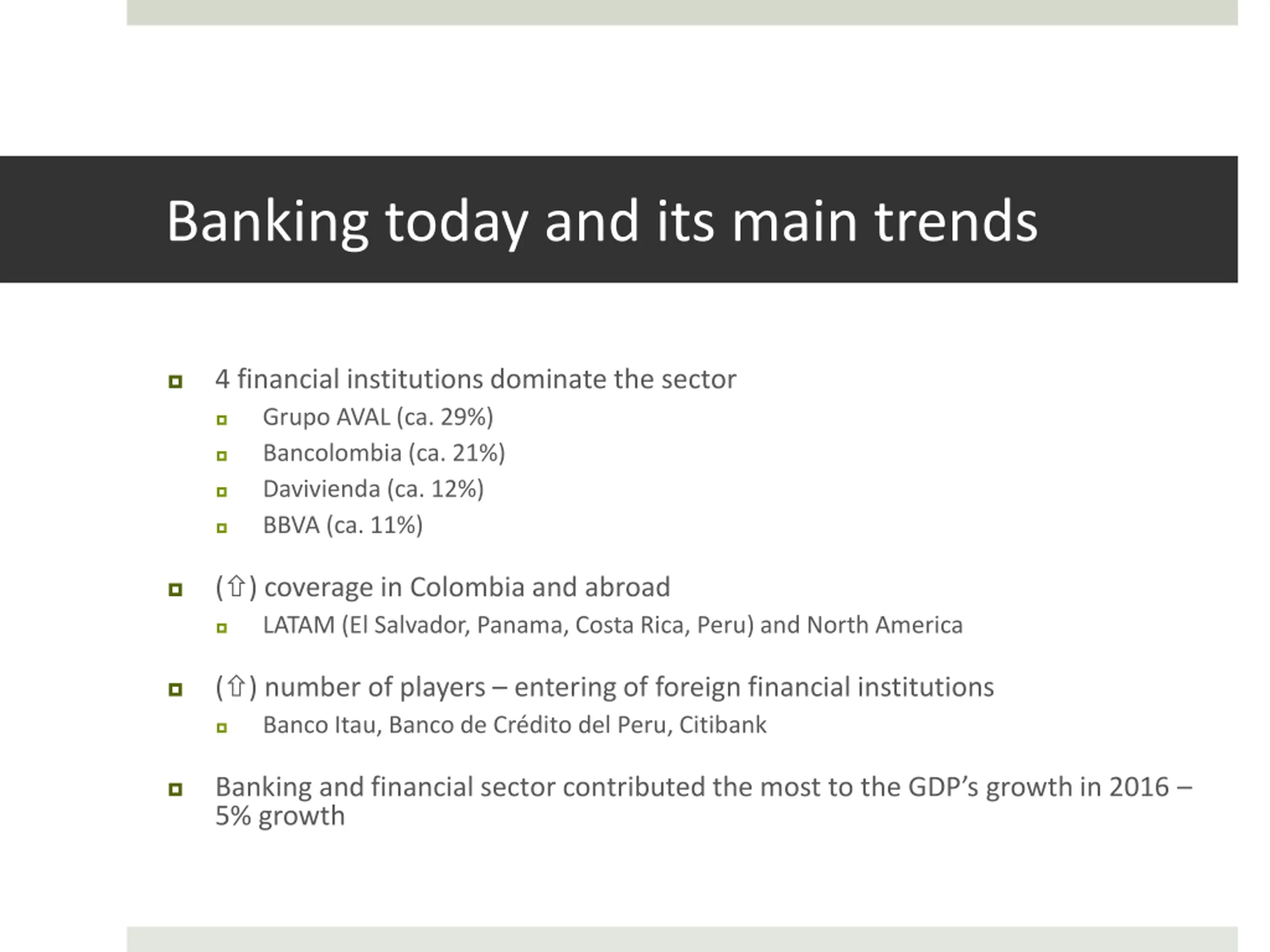 Banking today and its main trends 4 financial institutions dominate the sector Grupo AVAL (ca. 29%) Bancolombia (ca. 21%) Davivienda (ca. 12%) BBVA (ca. 11%) ( ) coverage in Colombia and abroad LATAM (El Salvador, Panama, Costa Rica, Peru) and North America ( ) number of players entering of foreign financial institutions Banco Itau, Banco de Cr dito del Peru, Citibank Banking and financial sector contributed the most to the GDP s growth in 2016 5% growth