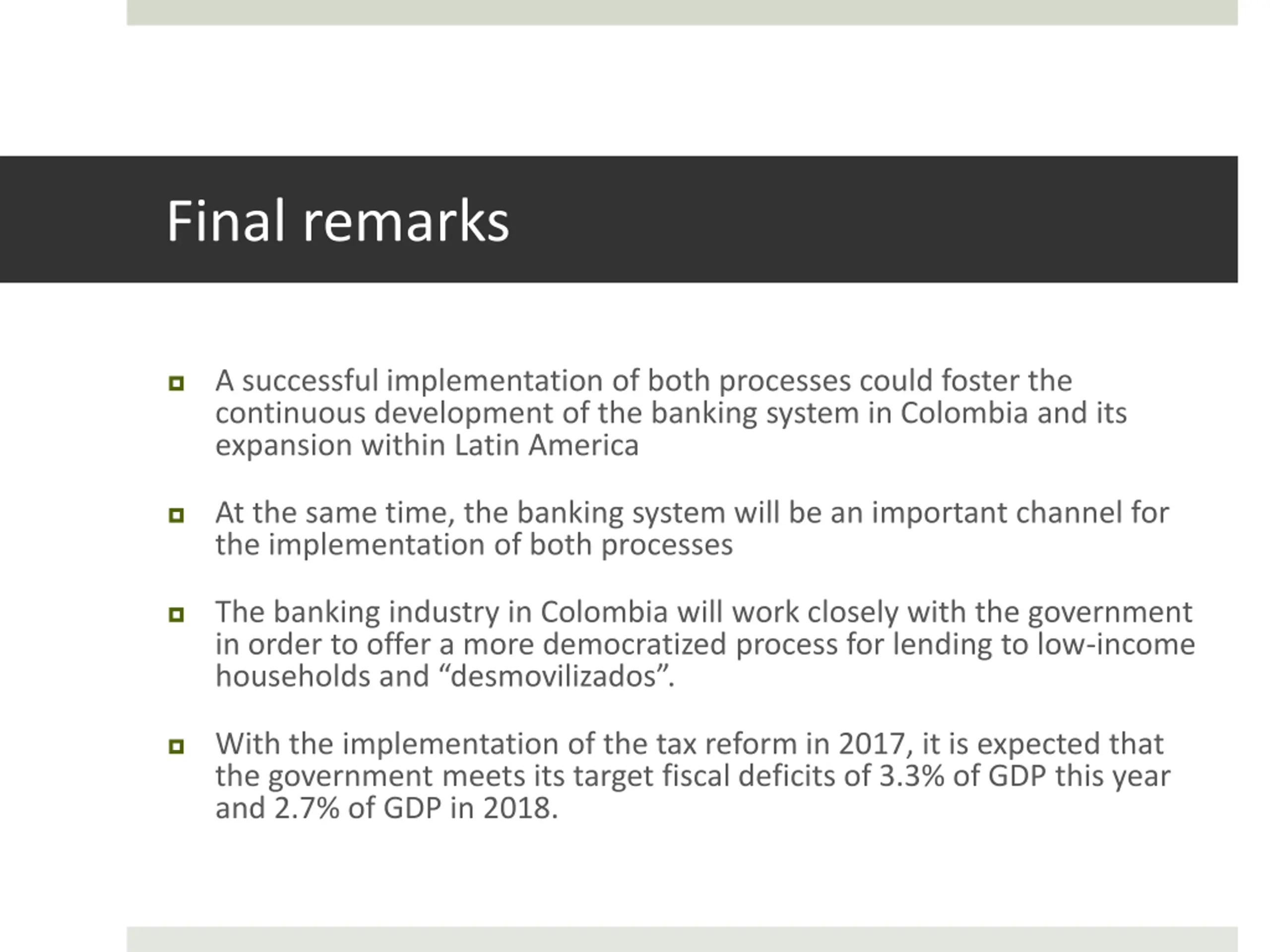 Final remarks A successful implementation of both processes could foster the continuous development of the banking system in Colombia and its expansion within Latin America At the same time, the banking system will be an important channel for the implementation of both processes The banking industry in Colombia will work closely with the government in order to offer a more democratized process for lending to low-income households and desmovilizados . With the implementation of the tax reform in 2017, it is expected that the government meets its target fiscal deficits of 3.3% of GDP this year and 2.7% of GDP in 2018.