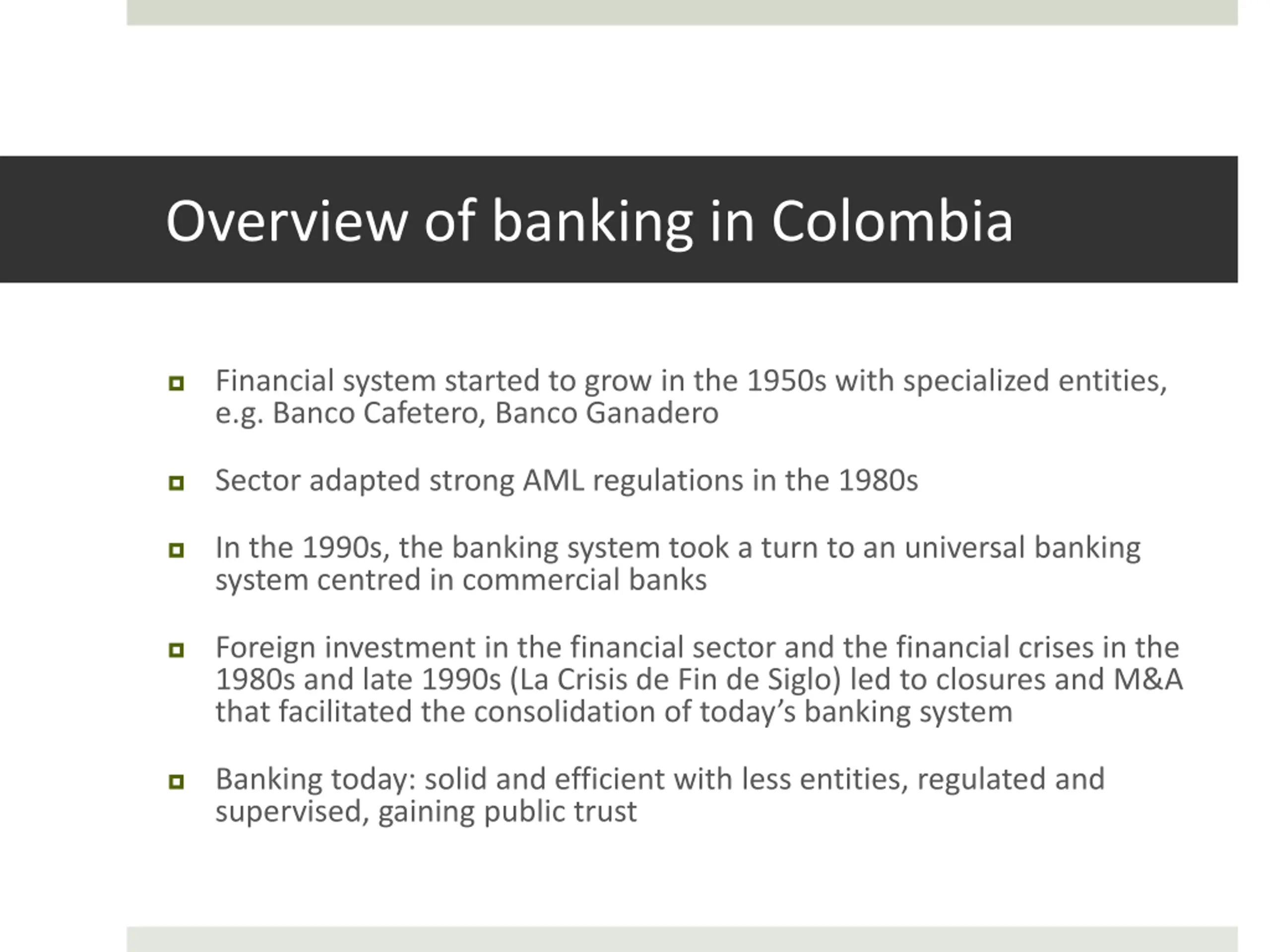 Overview of banking in Colombia Financial system started to grow in the 1950s with specialized entities, e.g. Banco Cafetero, Banco Ganadero Sector adapted strong AML regulations in the 1980s In the 1990s, the banking system took a turn to an universal banking system centred in commercial banks Foreign investment in the financial sector and the financial crises in the 1980s and late 1990s (La Crisis de Fin de Siglo) led to closures and M&A that facilitated the consolidation of today s banking system Banking today: solid and efficient with less entities, regulated and supervised, gaining public trust
