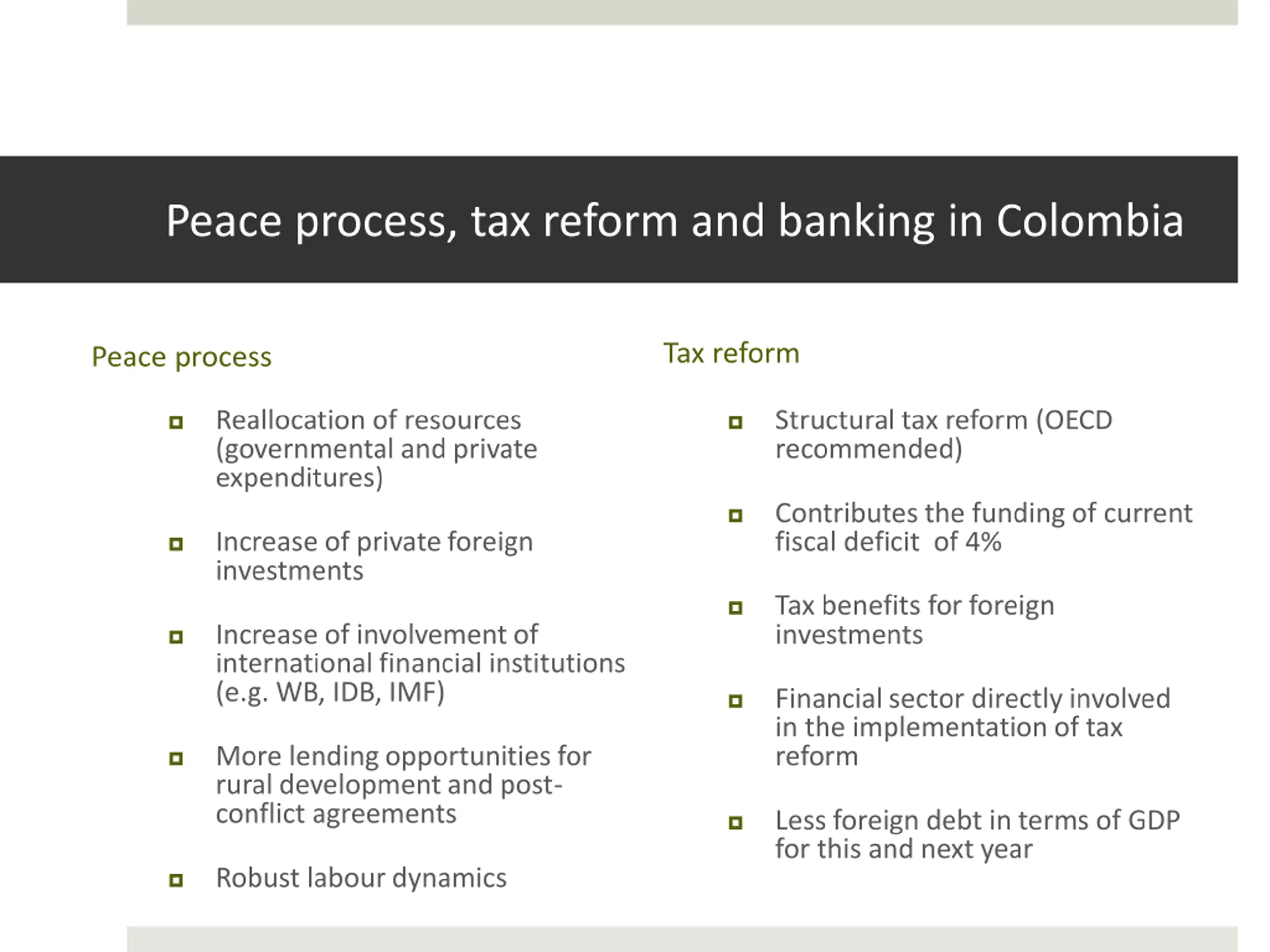Peace process, tax reform and banking in Colombia Tax reform Peace process Reallocation of resources (governmental and private expenditures) Structural tax reform (OECD recommended) Contributes the funding of current fiscal deficit of 4% Increase of private foreign investments Tax benefits for foreign investments Increase of involvement of international financial institutions (e.g. WB, IDB, IMF) Financial sector directly involved in the implementation of tax reform More lending opportunities for rural development and post- conflict agreements Less foreign debt in terms of GDP for this and next year Robust labour dynamics