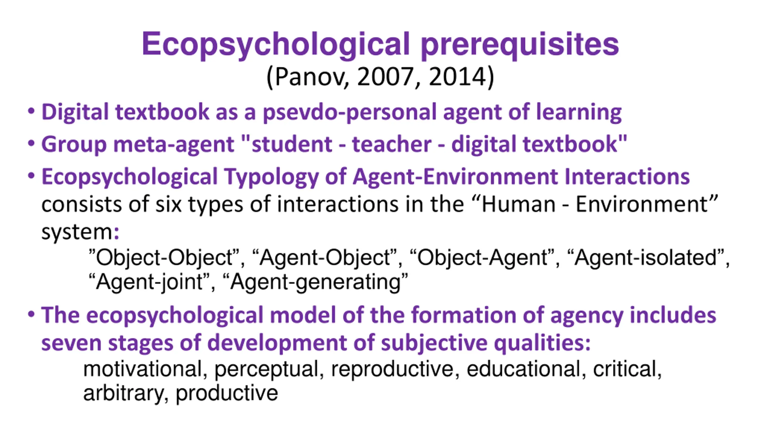 Ecopsychological prerequisites (Panov, 2007, 2014) Digital textbook as a psevdo-personal agent of learning Group meta-agent "student - teacher - digital textbook" Ecopsychological Typology of Agent-Environment Interactions consists of six types of interactions in the Human - Environment system: Object-Object , Agent-Object , Object-Agent , Agent-isolated , Agent-joint , Agent-generating The ecopsychological model of the formation of agency includes seven stages of development of subjective qualities: motivational, perceptual, reproductive, educational, critical, arbitrary, productive