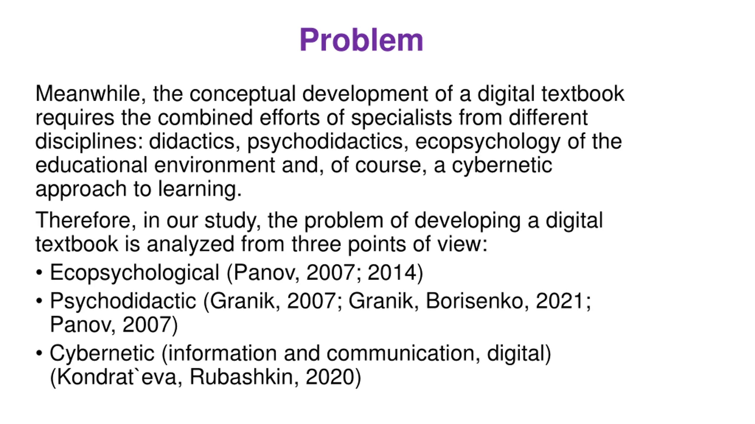 Problem Meanwhile, the conceptual development of a digital textbook requires the combined efforts of specialists from different disciplines: didactics, psychodidactics, ecopsychology of the educational environment and, of course, a cybernetic approach to learning. Therefore, in our study, the problem of developing a digital textbook is analyzed from three points of view: Ecopsychological (Panov, 2007; 2014) Psychodidactic (Granik, 2007; Granik, Borisenko, 2021; Panov, 2007) Cybernetic (information and communication, digital) (Kondrat`eva, Rubashkin, 2020)