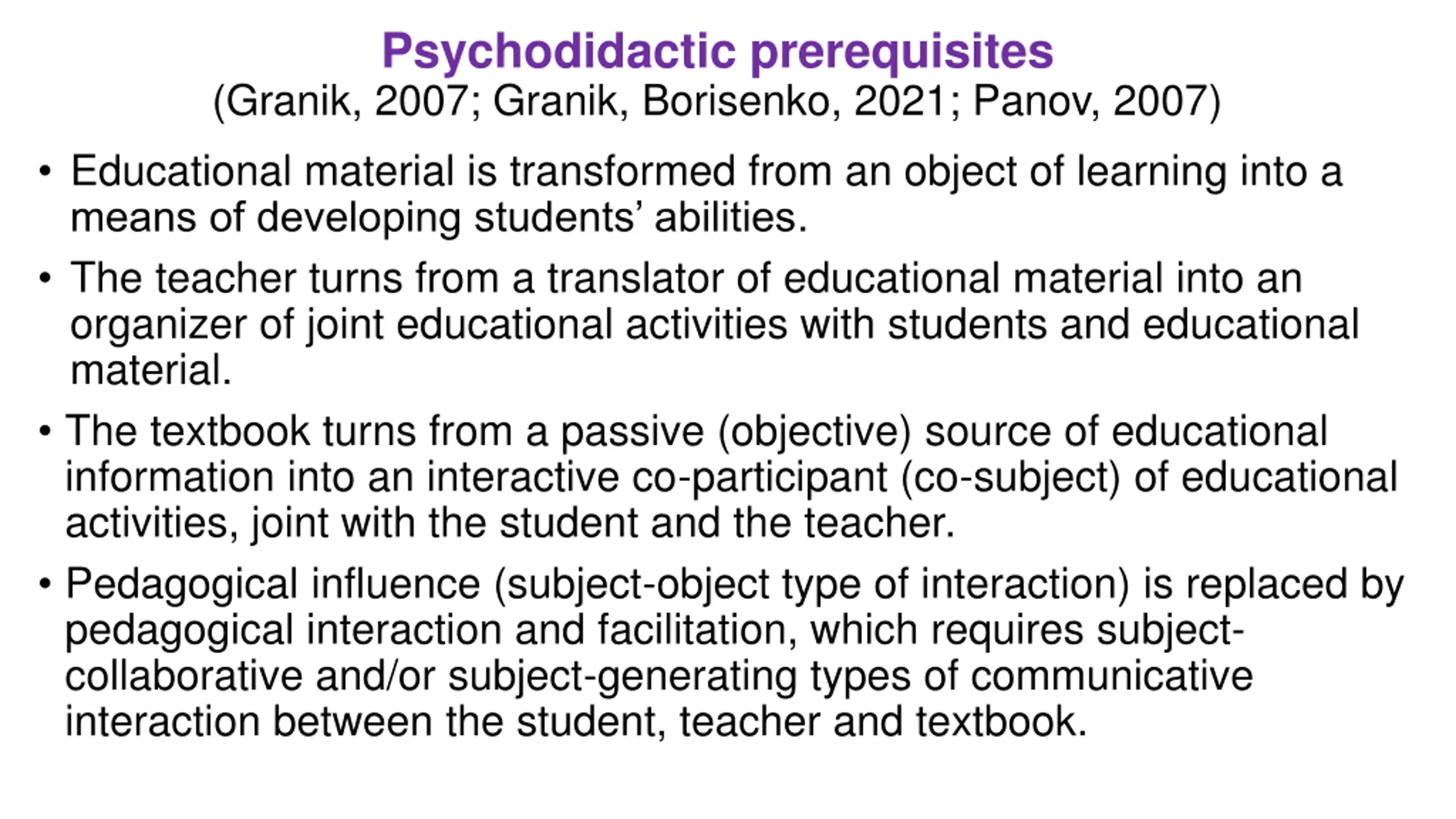 Psychodidactic prerequisites (Granik, 2007; Granik, Borisenko, 2021; Panov, 2007) Educational material is transformed from an object of learning into a means of developing students abilities. The teacher turns from a translator of educational material into an organizer of joint educational activities with students and educational material. The textbook turns from a passive (objective) source of educational information into an interactive co-participant (co-subject) of educational activities, joint with the student and the teacher. Pedagogical influence (subject-object type of interaction) is replaced by pedagogical interaction and facilitation, which requires subject- collaborative and/or subject-generating types of communicative interaction between the student, teacher and textbook.