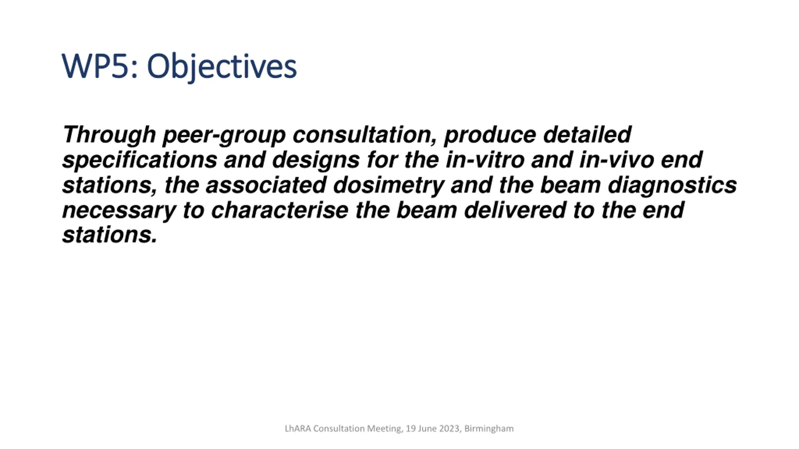 WP5: Objectives WP5: Objectives Through peer-group consultation, produce detailed specifications and designs for the in-vitro and in-vivo end stations, the associated dosimetry and the beam diagnostics necessary to characterise the beam delivered to the end stations. LhARA Consultation Meeting, 19 June 2023, Birmingham