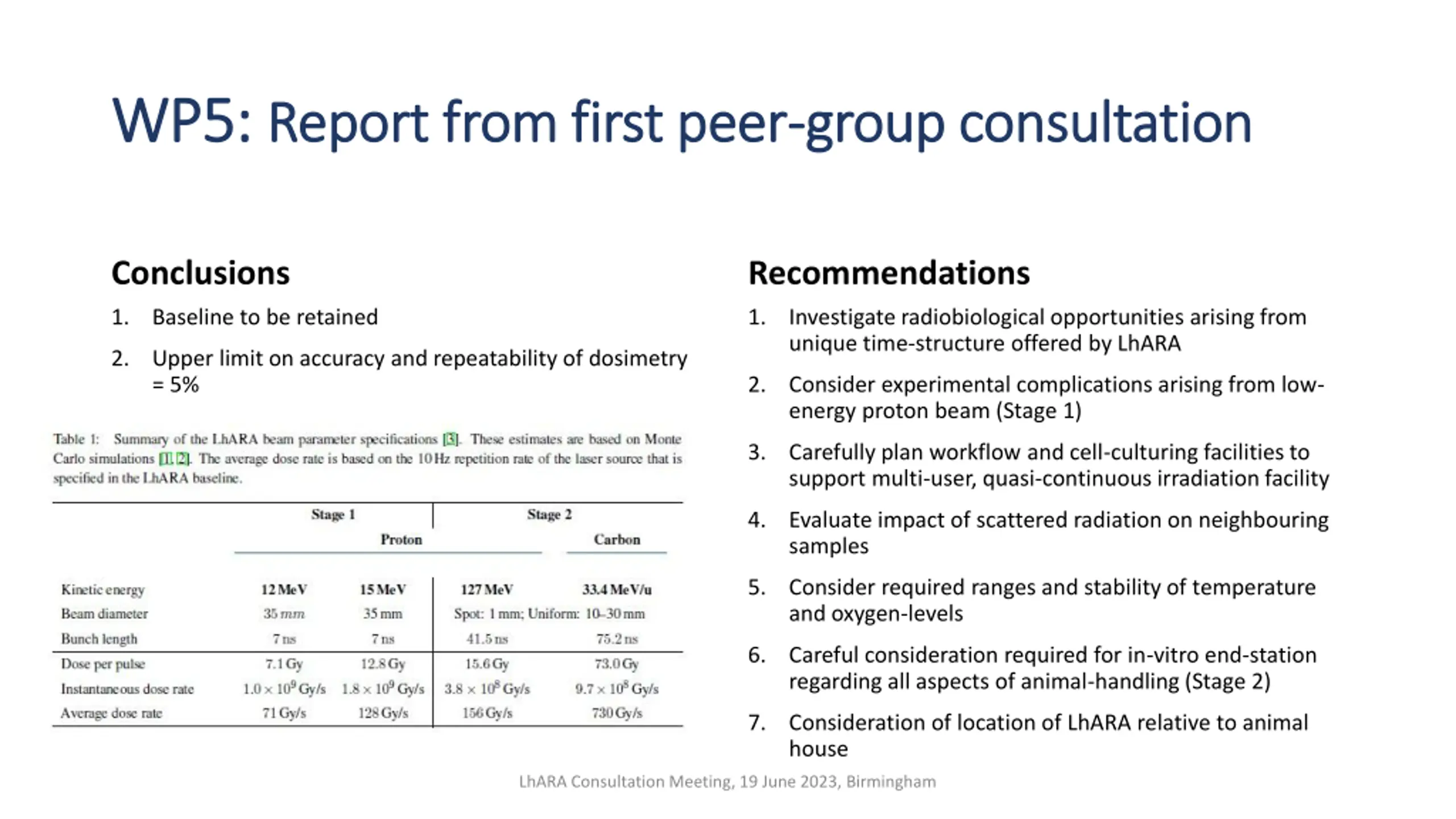 WP5: WP5: Report from first peer Report from first peer- -group consultation group consultation Conclusions Recommendations 1. Baseline to be retained 1. Investigate radiobiological opportunities arising from unique time-structure offered by LhARA 2. Upper limit on accuracy and repeatability of dosimetry = 5% 2. Consider experimental complications arising from low- energy proton beam (Stage 1) 3. Carefully plan workflow and cell-culturing facilities to support multi-user, quasi-continuous irradiation facility 4. Evaluate impact of scattered radiation on neighbouring samples 5. Consider required ranges and stability of temperature and oxygen-levels 6. Careful consideration required for in-vitro end-station regarding all aspects of animal-handling (Stage 2) 7. Consideration of location of LhARA relative to animal house LhARA Consultation Meeting, 19 June 2023, Birmingham