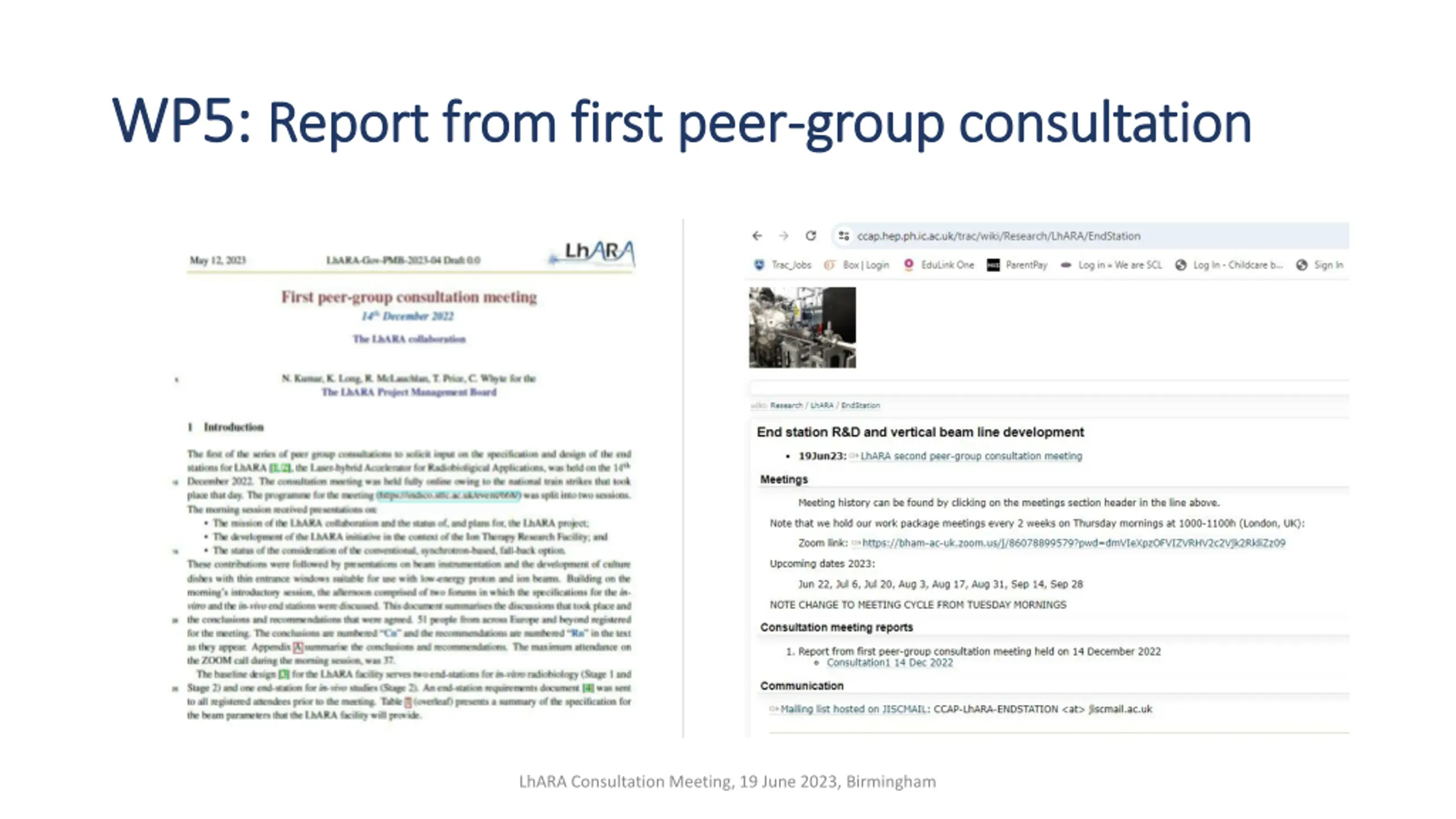 WP5: Novel end station development WP5: Novel end station development Report from 1st peer Report from 1st peer- -group consultation meeting meeting 14 Dec 2022 14 Dec 2022 group consultation Dr Ruth McLauchlan Imperial College Healthcare NHS Trust Dr Tony Price University of Birmingham Dr Carsten Welsch University of Liverpool LhARA Consultation Meeting, 19 June 2023, Birmingham