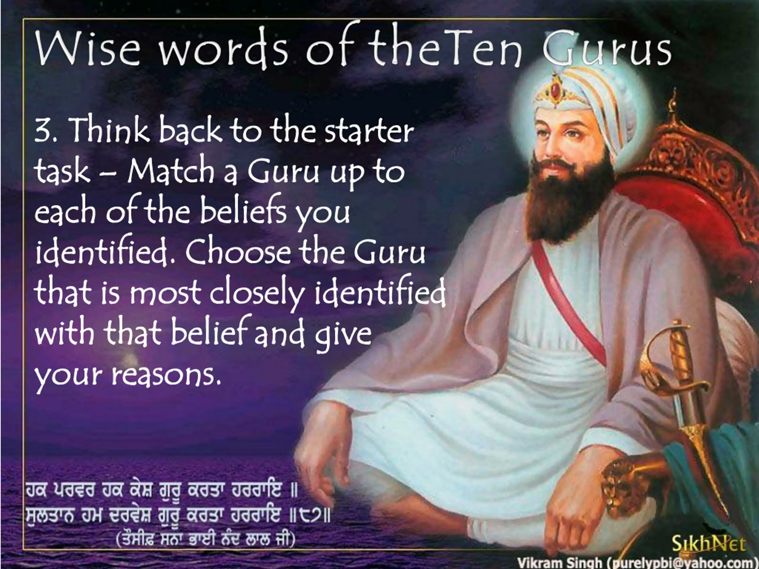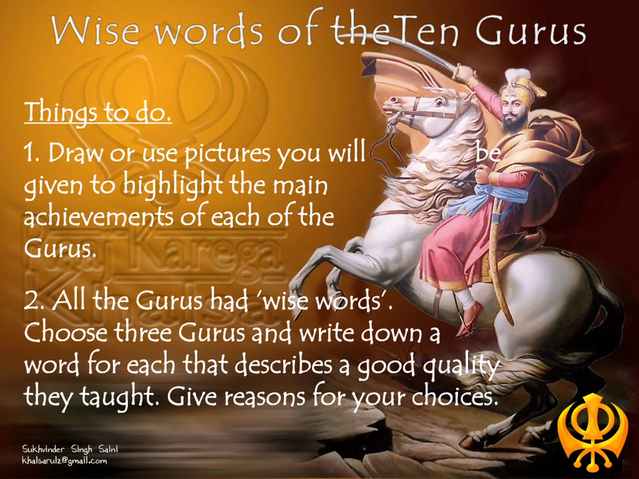 Things to do Things to do. . 1. Draw or use pictures you will be 1. Draw or use pictures you will be given to highlight the main given to highlight the main achievements of each of the achievements of each of the Gurus. Gurus. 2. 2. All the Gurus had wise words . All the Gurus had wise words . Choose three Gurus and write down a Choose three Gurus and write down a word for each that describes a good quality word for each that describes a good quality they taught they taught. Give reasons for your choices. . Give reasons for your choices.