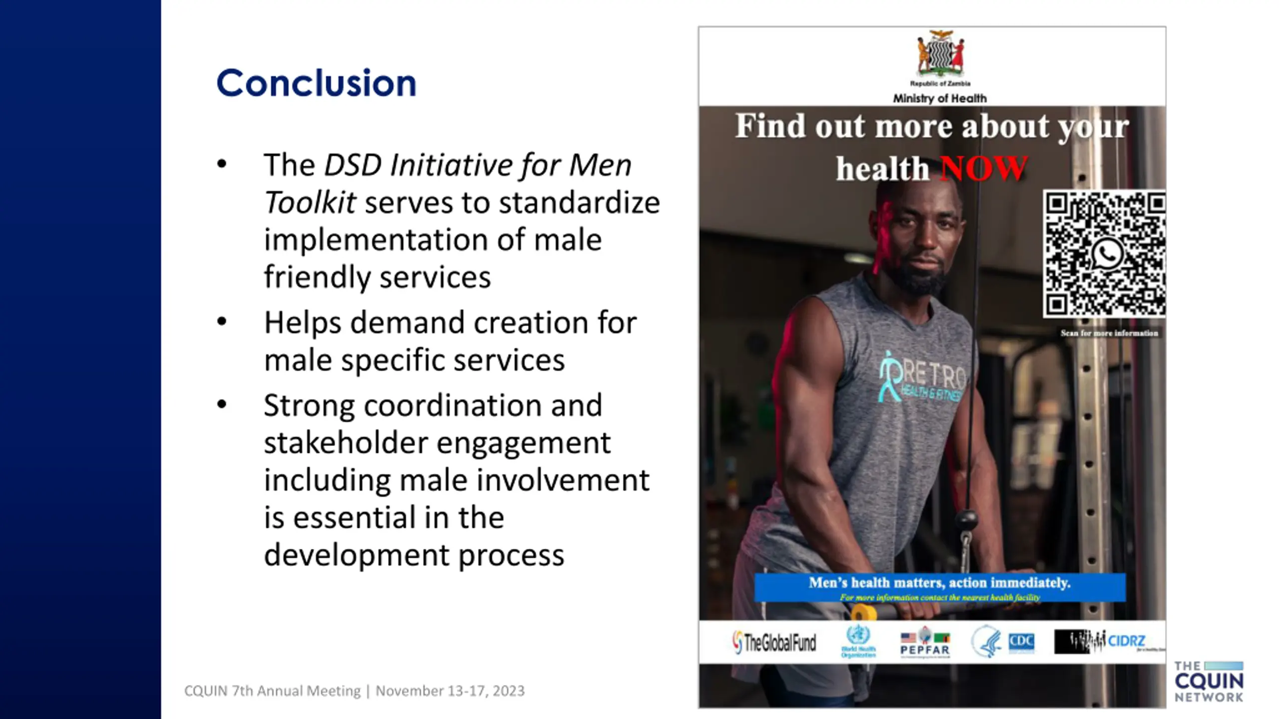 Conclusion The DSD Initiative for Men Toolkit serves to standardize implementation of male friendly services Helps demand creation for male specific services Strong coordination and stakeholder engagement including male involvement is essential in the development process CQUIN 7th Annual Meeting | November 13-17, 2023