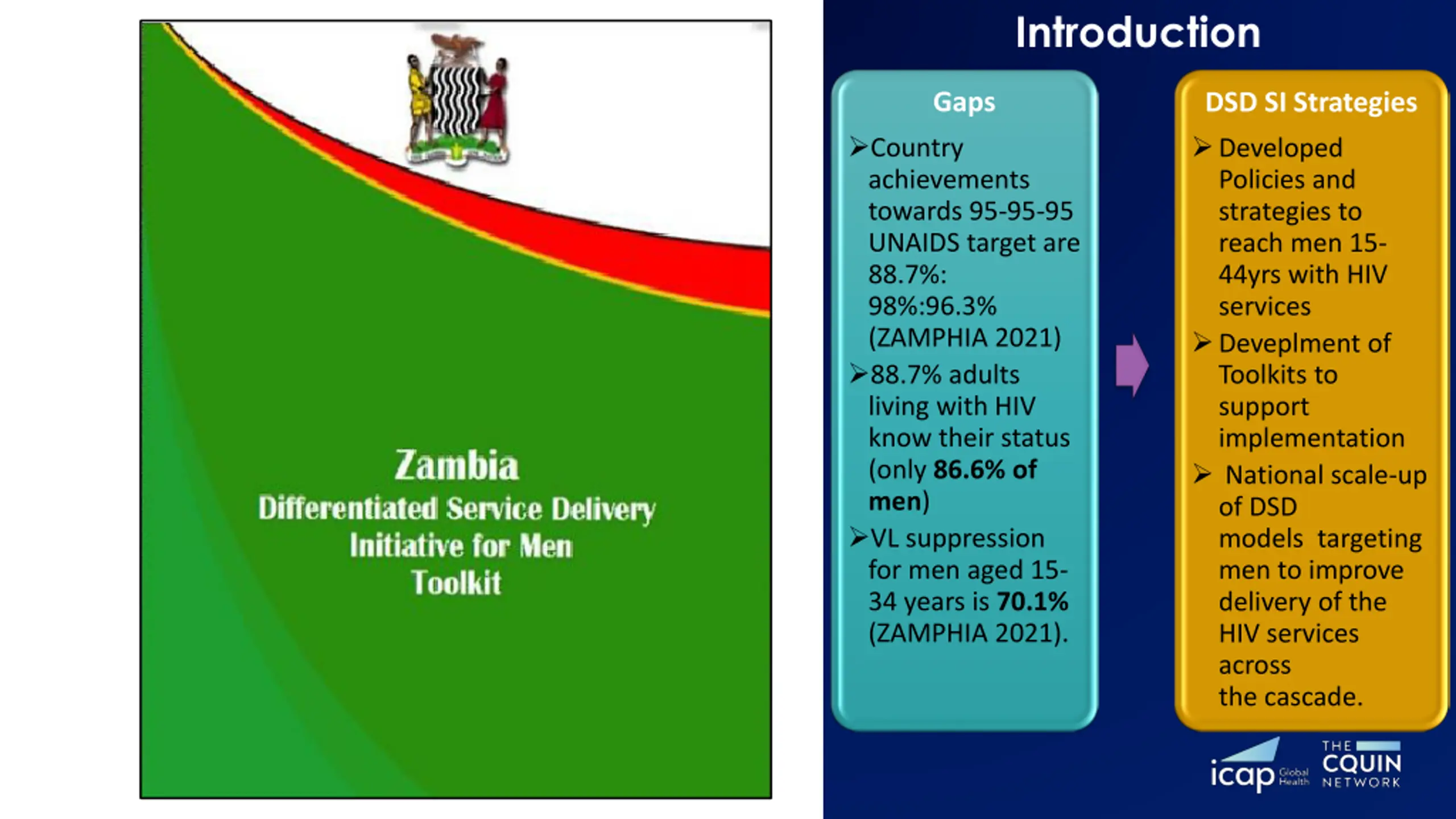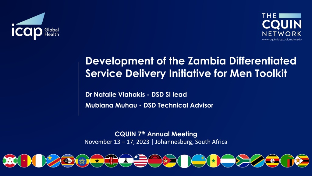 www.cquin.icap.columbia.edu Development of the Zambia Differentiated Service Delivery Initiative for Men Toolkit Dr Natalie Vlahakis - DSD SI lead Mubiana Muhau - DSD Technical Advisor CQUIN 7thAnnual Meeting November 13 17, 2023 | Johannesburg, South Africa