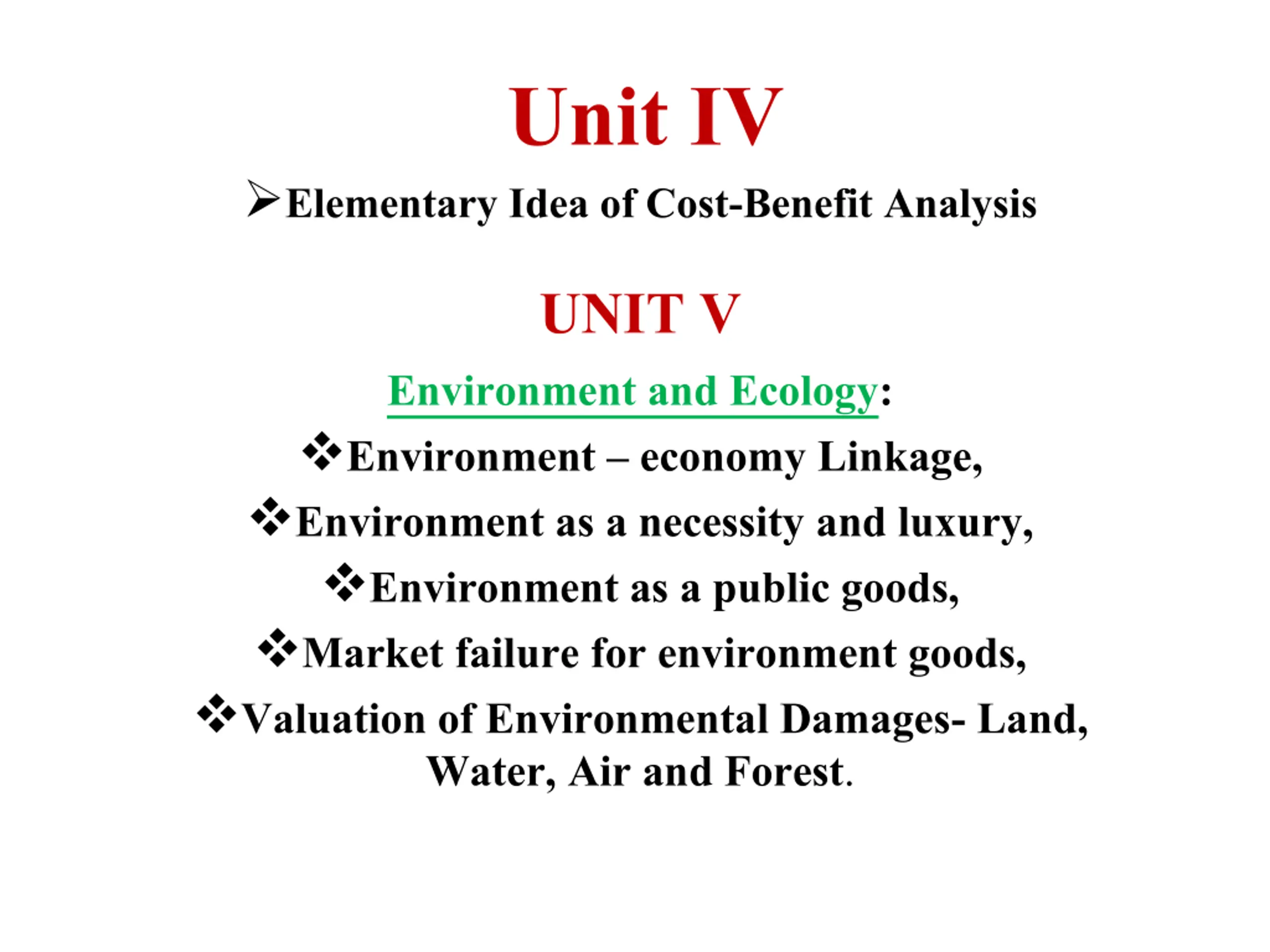 Unit IV Elementary Idea of Cost-Benefit Analysis UNIT V Environment and Ecology: Environment economy Linkage, Environment as a necessity and luxury, Environment as a public goods, Market failure for environment goods, Valuation of Environmental Damages- Land, Water, Air and Forest.
