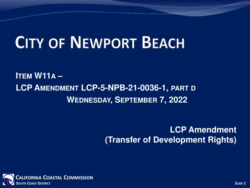 ITEM W11A LCP AMENDMENT LCP-5-NPB-21-0036-1, PART D WEDNESDAY, SEPTEMBER 7, 2022 LCP Amendment (Transfer of Development Rights) CALIFORNIA COASTAL COMMISSION SOUTH COAST DISTRICT SLIDE 1