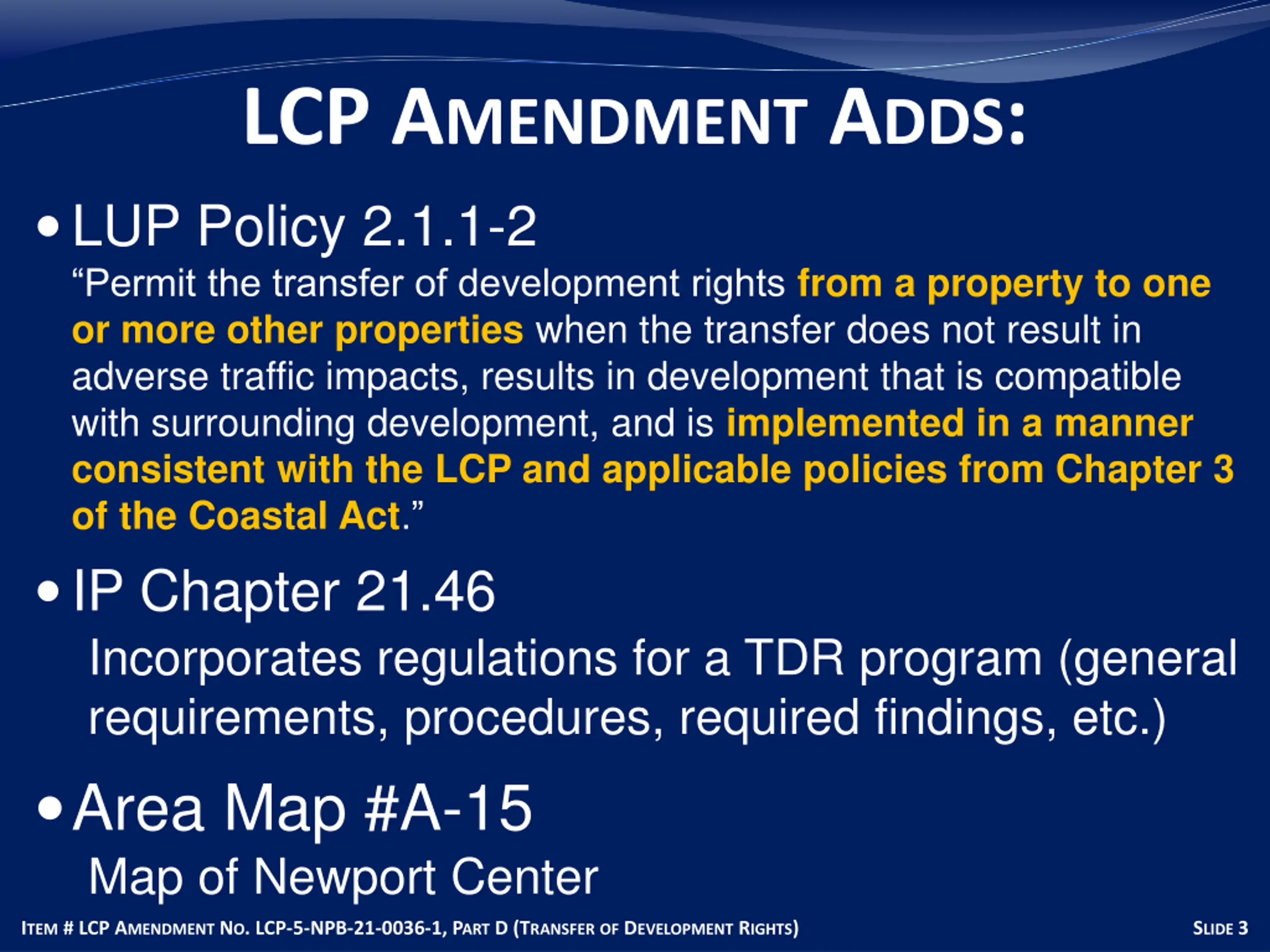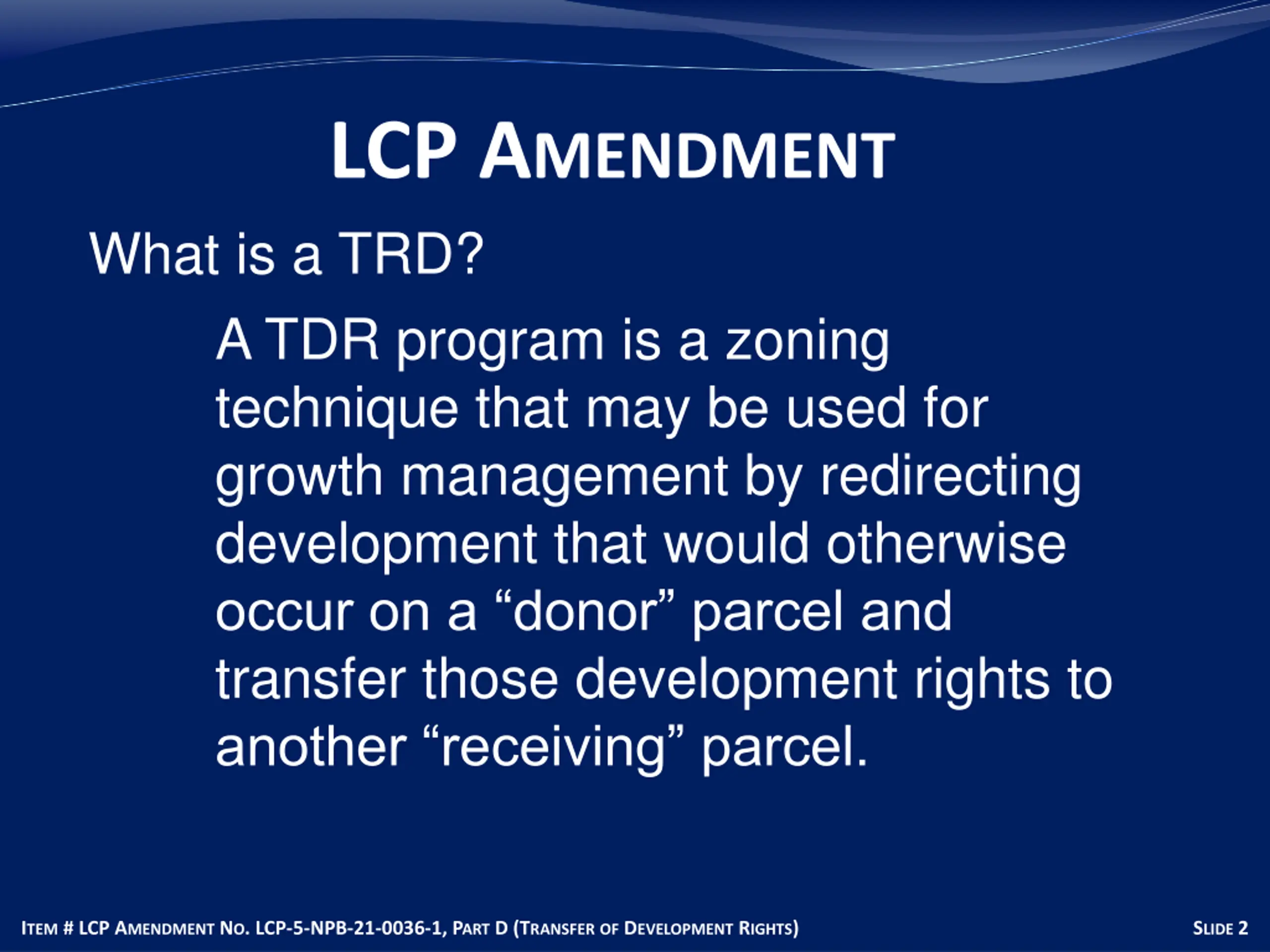 LCP AMENDMENT What is a TRD? A TDR program is a zoning technique that may be used for growth management by redirecting development that would otherwise occur on a donor parcel and transfer those development rights to another receiving parcel. ITEM # LCP AMENDMENT NO. LCP-5-NPB-21-0036-1, PART D (TRANSFEROF DEVELOPMENT RIGHTS) SLIDE 2