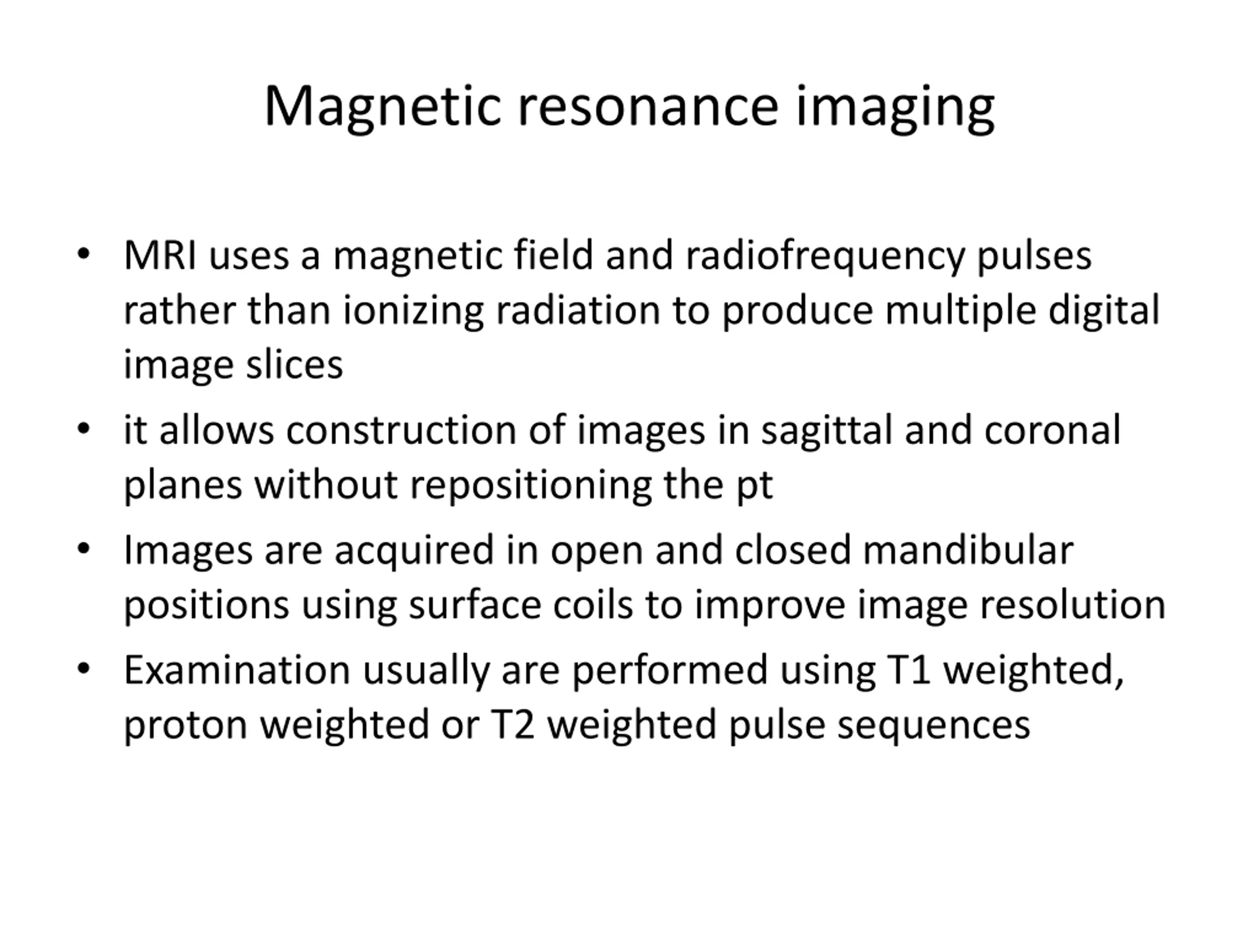 Magnetic resonance imaging MRI uses a magnetic field and radiofrequency pulses rather than ionizing radiation to produce multiple digital image slices it allows construction of images in sagittal and coronal planes without repositioning the pt Images are acquired in open and closed mandibular positions using surface coils to improve image resolution Examination usually are performed using T1 weighted, proton weighted or T2 weighted pulse sequences