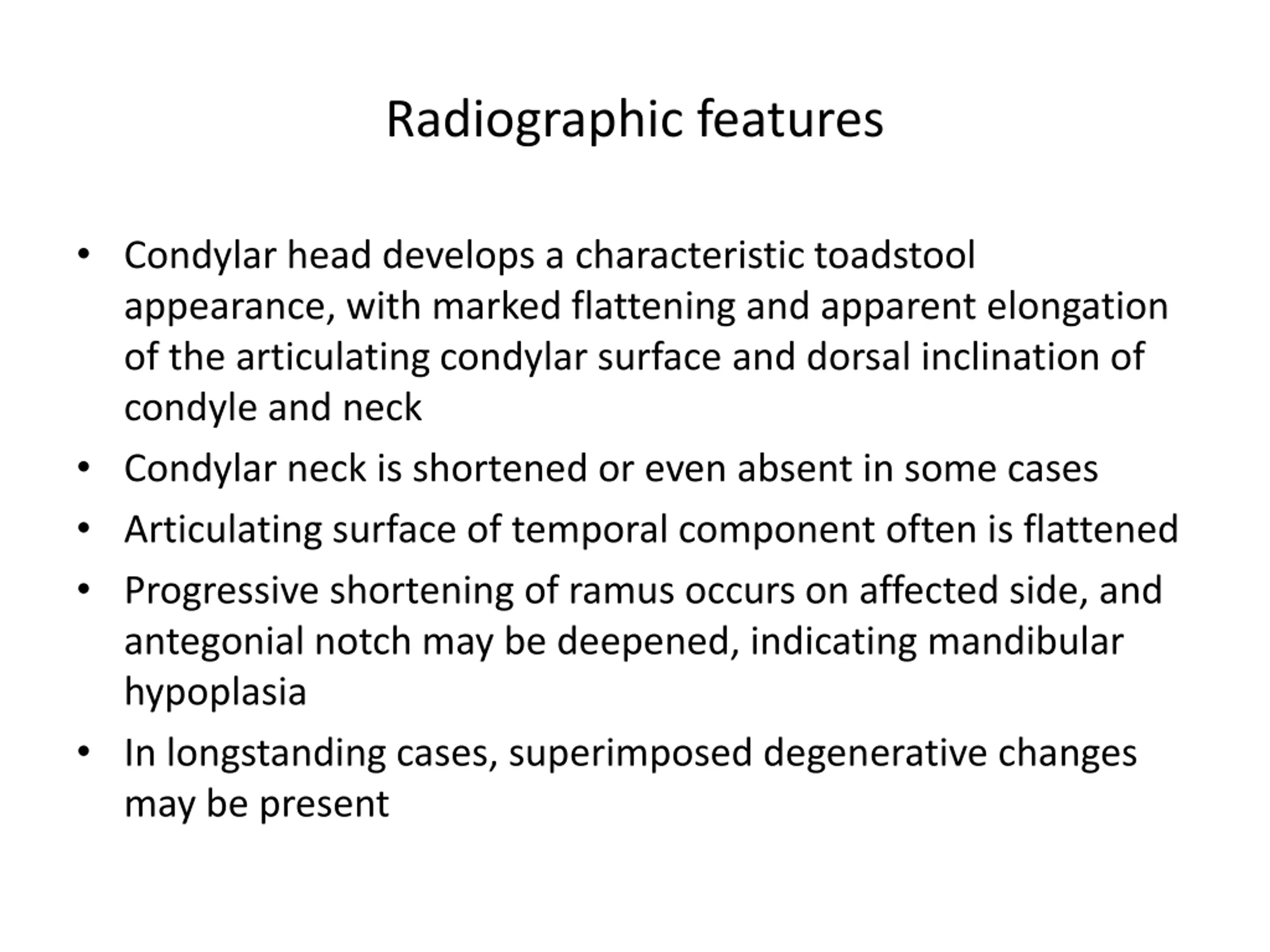 Radiographic features Condylar head develops a characteristic toadstool appearance, with marked flattening and apparent elongation of the articulating condylar surface and dorsal inclination of condyle and neck Condylar neck is shortened or even absent in some cases Articulating surface of temporal component often is flattened Progressive shortening of ramus occurs on affected side, and antegonial notch may be deepened, indicating mandibular hypoplasia In longstanding cases, superimposed degenerative changes may be present