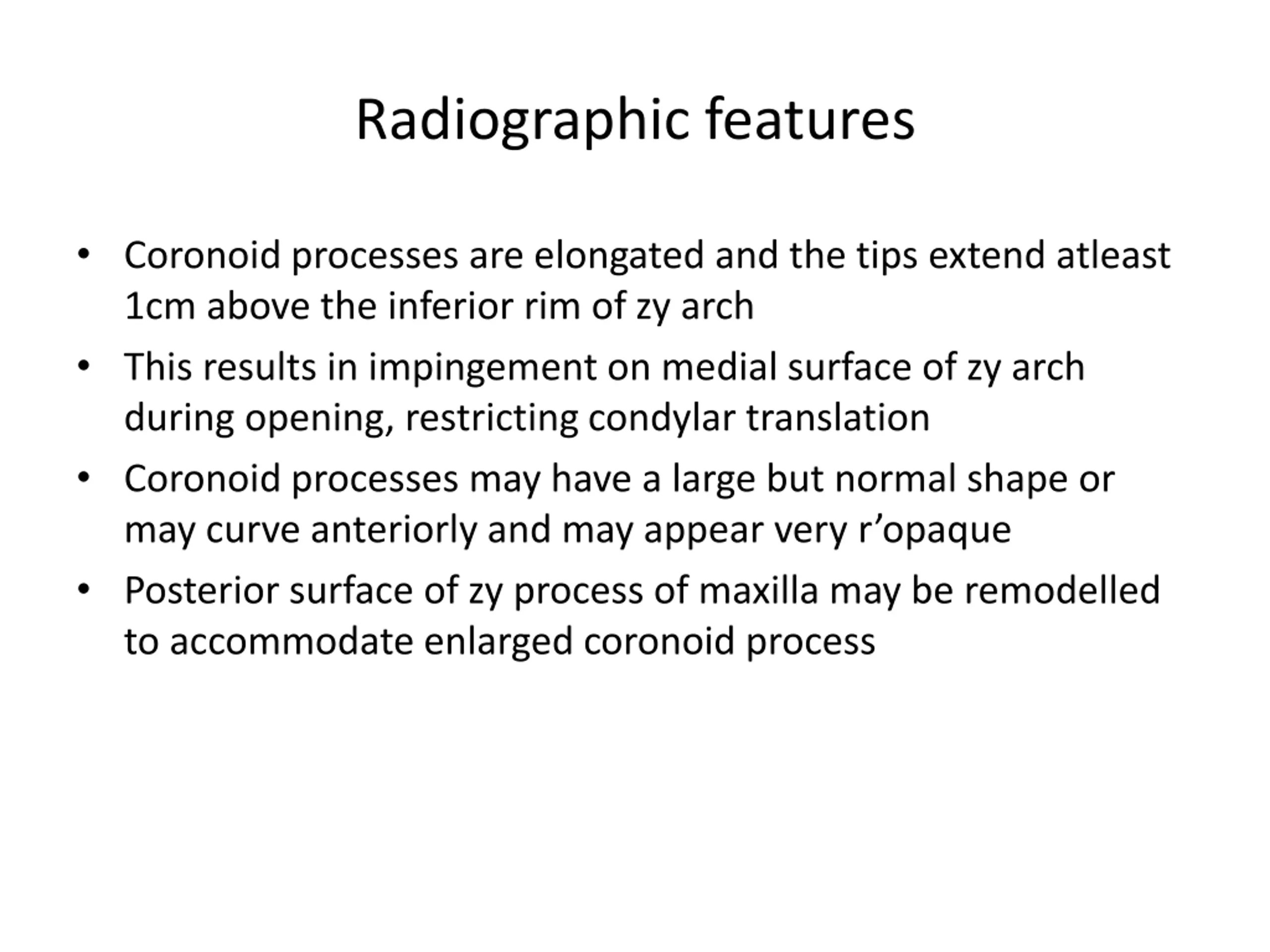 Radiographic features Coronoid processes are elongated and the tips extend atleast 1cm above the inferior rim of zy arch This results in impingement on medial surface of zy arch during opening, restricting condylar translation Coronoid processes may have a large but normal shape or may curve anteriorly and may appear very r opaque Posterior surface of zy process of maxilla may be remodelled to accommodate enlarged coronoid process