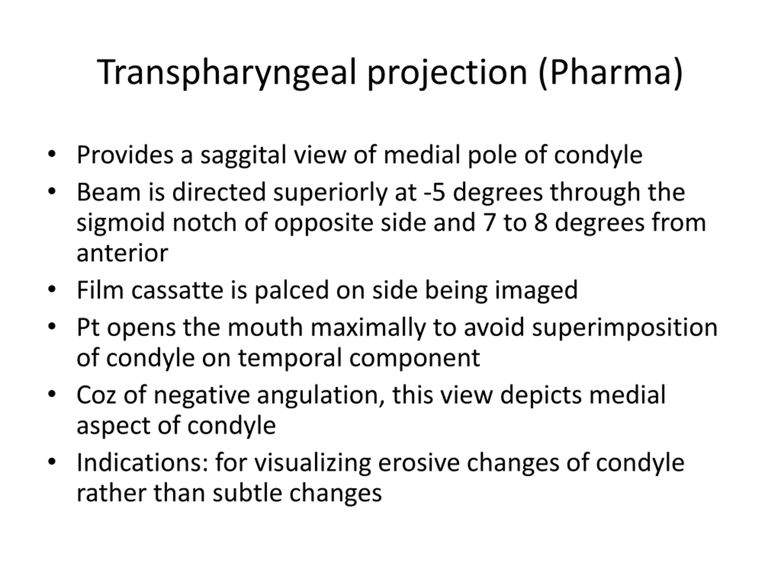 Transpharyngeal projection (Pharma) Provides a saggital view of medial pole of condyle Beam is directed superiorly at -5 degrees through the sigmoid notch of opposite side and 7 to 8 degrees from anterior Film cassatte is palced on side being imaged Pt opens the mouth maximally to avoid superimposition of condyle on temporal component Coz of negative angulation, this view depicts medial aspect of condyle Indications: for visualizing erosive changes of condyle rather than subtle changes
