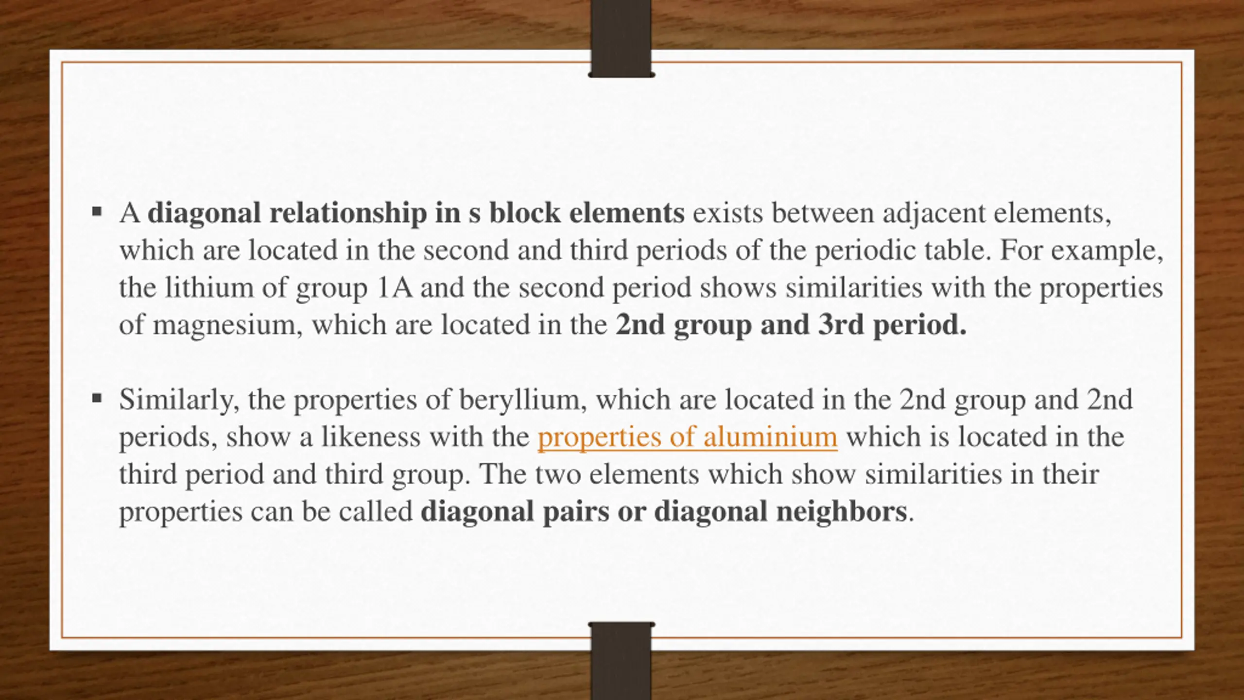 Adiagonal relationship in s block elements exists between adjacent elements, which are located in the second and third periods of the periodic table. For example, the lithium of group 1A and the second period shows similarities with the properties of magnesium, which are located in the 2nd group and 3rd period. Similarly, the properties of beryllium, which are located in the 2nd group and 2nd periods, show a likeness with the properties of aluminium which is located in the third period and third group. The two elements which show similarities in their properties can be called diagonal pairs or diagonal neighbors.