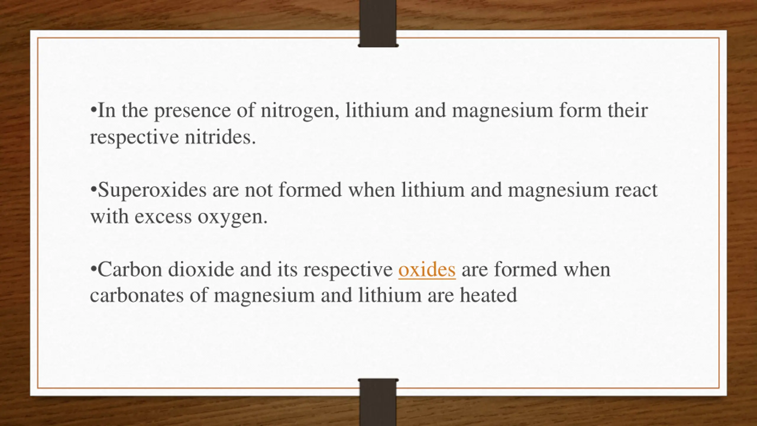 In the presence of nitrogen, lithium and magnesium form their respective nitrides. Superoxides are not formed when lithium and magnesium react with excess oxygen. Carbon dioxide and its respective oxides are formed when carbonates of magnesium and lithium are heated