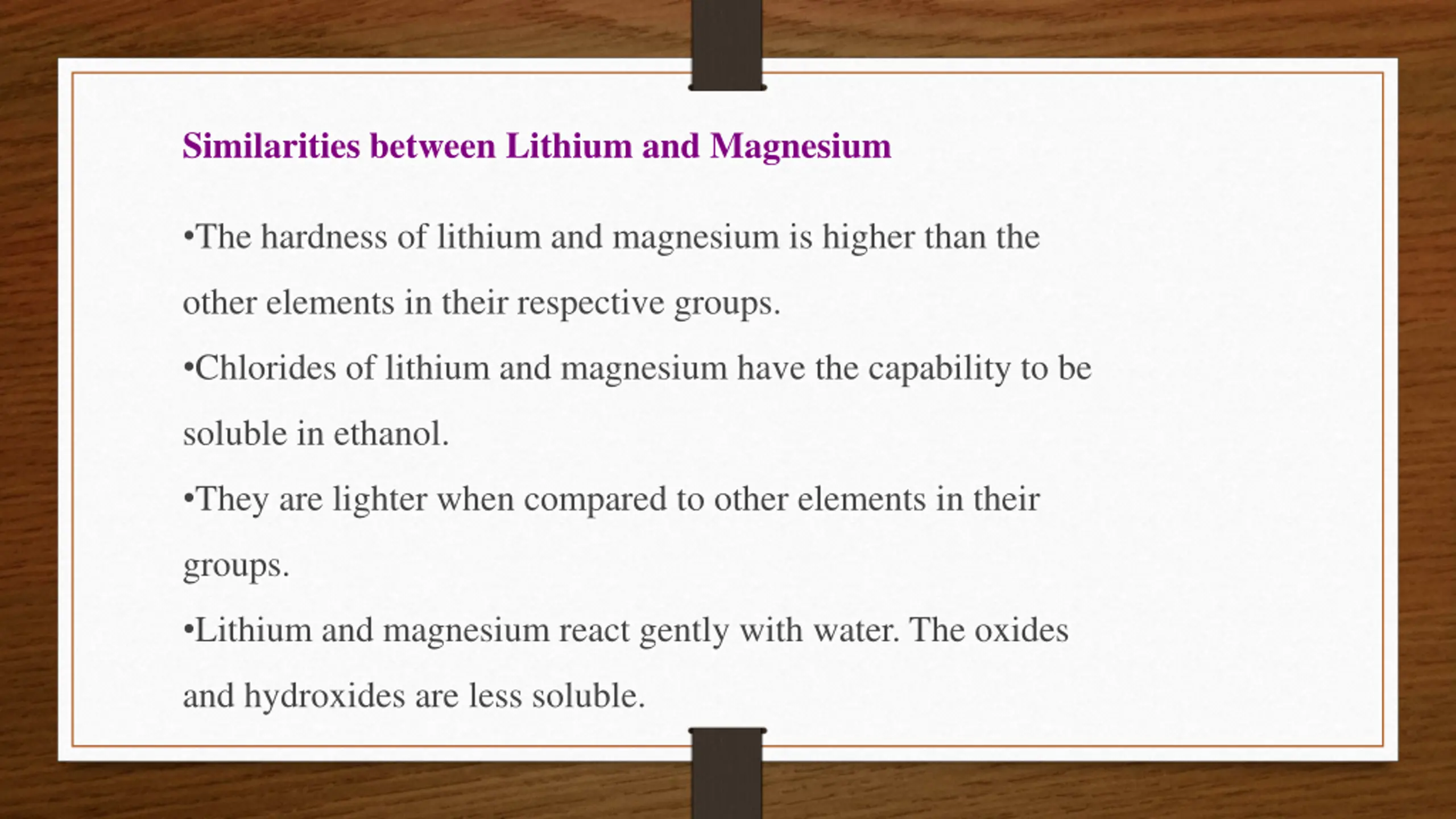 Similarities between Lithium and Magnesium The hardness of lithium and magnesium is higher than the other elements in their respective groups. Chlorides of lithium and magnesium have the capability to be soluble in ethanol. They are lighter when compared to other elements in their groups. Lithium and magnesium react gently with water. The oxides and hydroxides are less soluble.