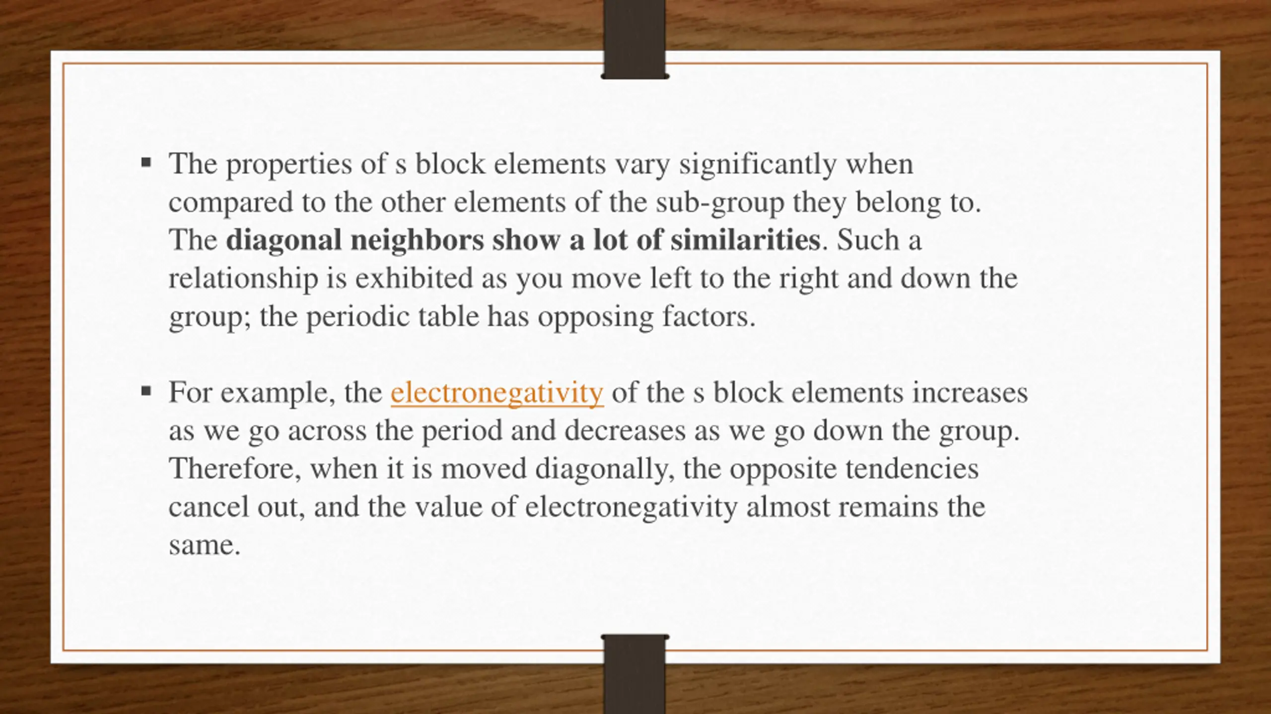 The properties of s block elements vary significantly when compared to the other elements of the sub-group they belong to. The diagonal neighbors show a lot of similarities. Such a relationship is exhibited as you move left to the right and down the group; the periodic table has opposing factors. For example, the electronegativity of the s block elements increases as we go across the period and decreases as we go down the group. Therefore, when it is moved diagonally, the opposite tendencies cancel out, and the value of electronegativity almost remains the same.