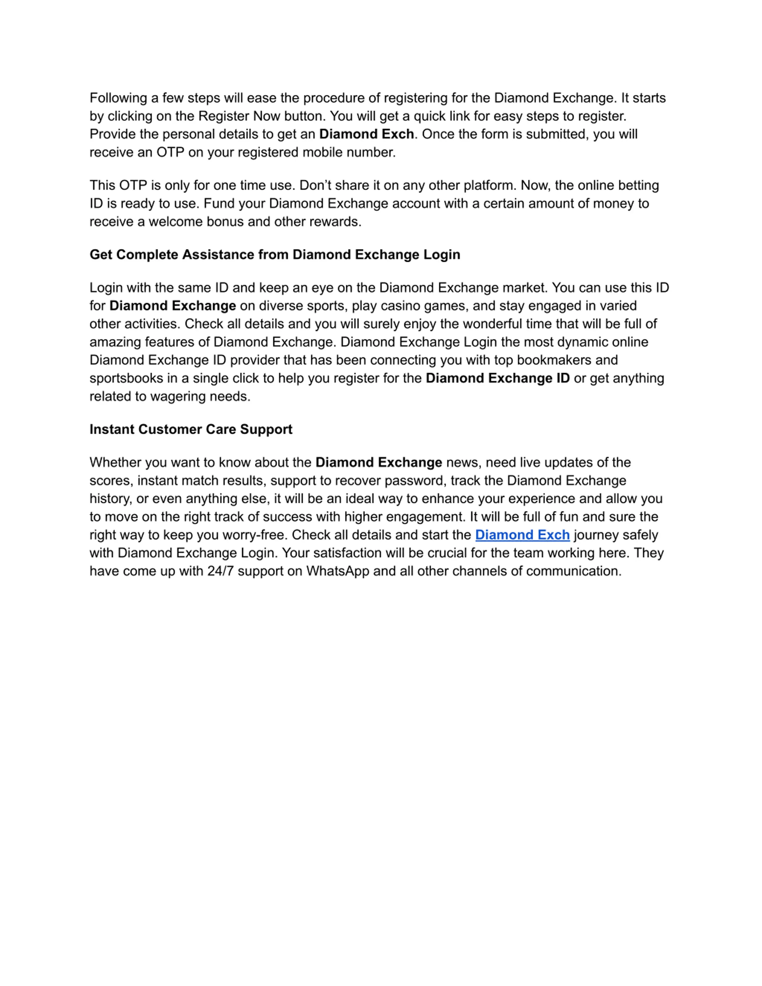 Following a few steps will ease the procedure of registering for the Diamond Exchange. It starts by clicking on the Register Now button. You will get a quick link for easy steps to register. Provide the personal details to get an Diamond Exch. Once the form is submitted, you will receive an OTP on your registered mobile number. This OTP is only for one time use. Don t share it on any other platform. Now, the online betting ID is ready to use. Fund your Diamond Exchange account with a certain amount of money to receive a welcome bonus and other rewards. Get Complete Assistance from Diamond Exchange Login Login with the same ID and keep an eye on the Diamond Exchange market. You can use this ID for Diamond Exchange on diverse sports, play casino games, and stay engaged in varied other activities. Check all details and you will surely enjoy the wonderful time that will be full of amazing features of Diamond Exchange. Diamond Exchange Login the most dynamic online Diamond Exchange ID provider that has been connecting you with top bookmakers and sportsbooks in a single click to help you register for the Diamond Exchange ID or get anything related to wagering needs. Instant Customer Care Support Whether you want to know about the Diamond Exchange news, need live updates of the scores, instant match results, support to recover password, track the Diamond Exchange history, or even anything else, it will be an ideal way to enhance your experience and allow you to move on the right track of success with higher engagement. It will be full of fun and sure the right way to keep you worry-free. Check all details and start the Diamond Exch journey safely with Diamond Exchange Login. Your satisfaction will be crucial for the team working here. They have come up with 24/7 support on WhatsApp and all other channels of communication.