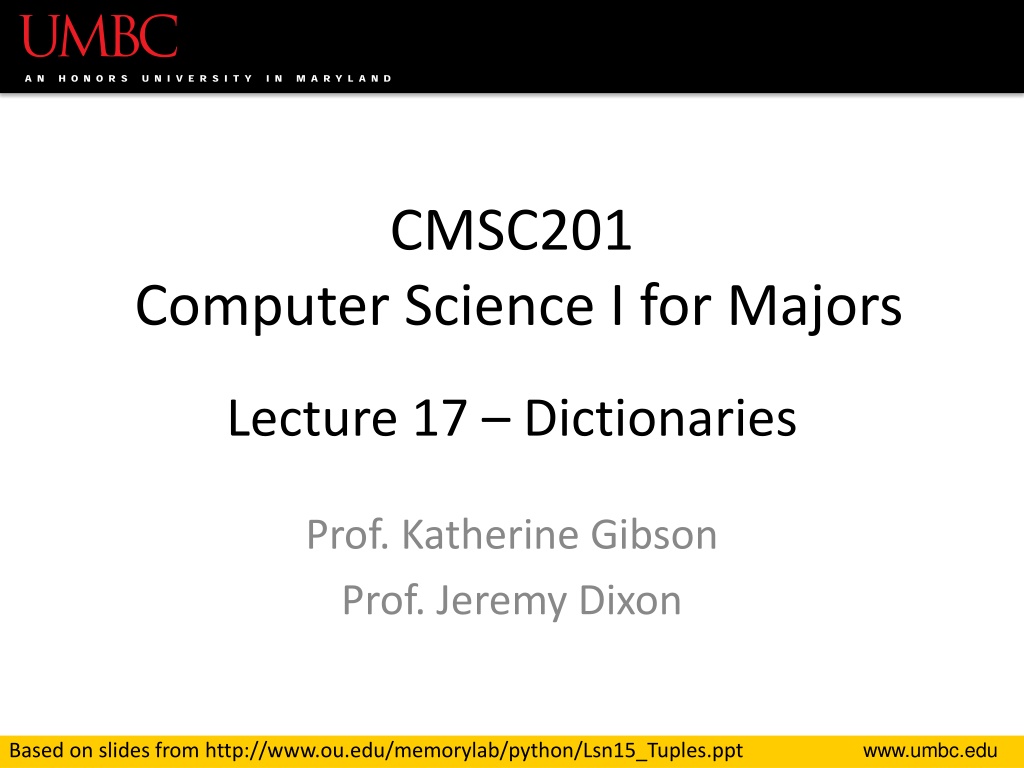 CMSC201 Computer Science I for Majors Lecture 17 Dictionaries Prof. Katherine Gibson Prof. Jeremy Dixon www.umbc.edu Based on slides from http://www.ou.edu/memorylab/python/Lsn15_Tuples.ppt
