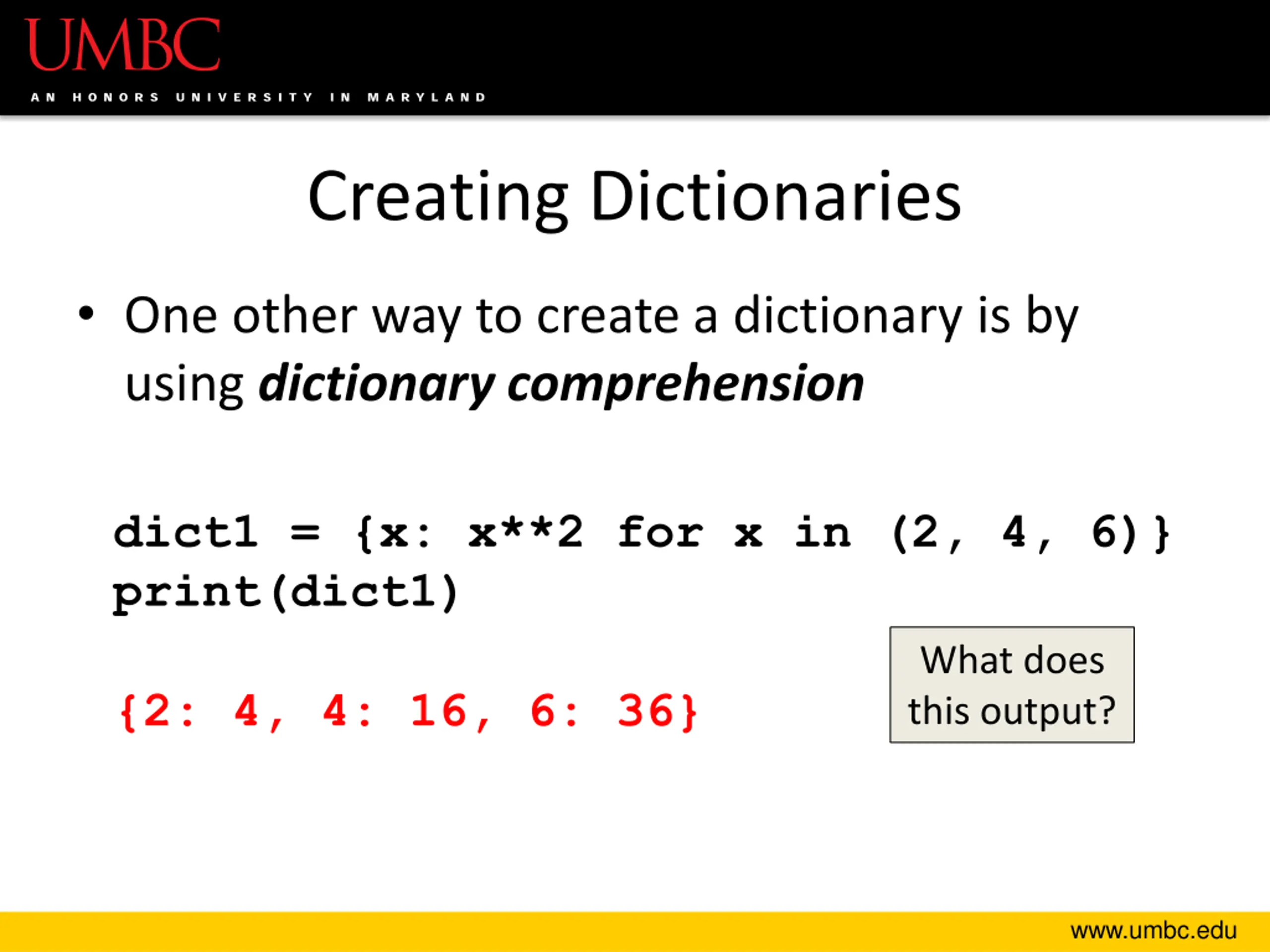 Creating Dictionaries One other way to create a dictionary is by using dictionary comprehension dict1 = {x: x**2 for x in (2, 4, 6)} print(dict1) What does this output? {2: 4, 4: 16, 6: 36} www.umbc.edu