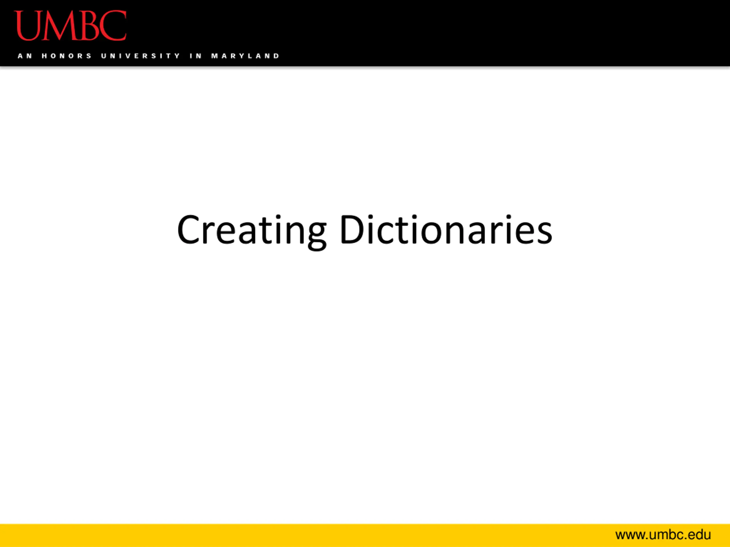 Creating Dictionaries There are three main ways to create a dictionary in Python: 1. Construct a python dictionary (with curly braces syntax) 2. Construct a dictionary from a list (or any iterable data structure) of key, value pairs 3. Construct a dictionary from parallel lists www.umbc.edu