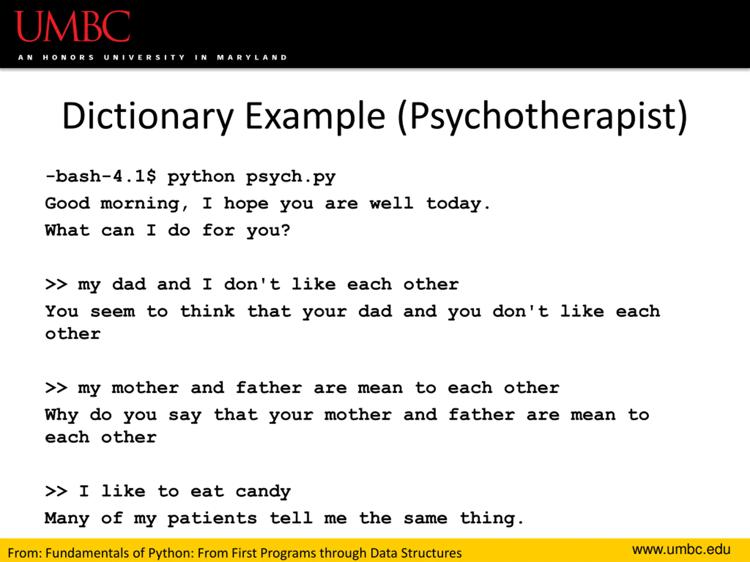 Dictionary Example (Psychotherapist) A doctor in this kind of therapy responds to patient s statements by rephrasing them or indirectly asking for more information For example: Writing a program that emulates a nondirective psychotherapist www.umbc.edu From: Fundamentals of Python: From First Programs through Data Structures