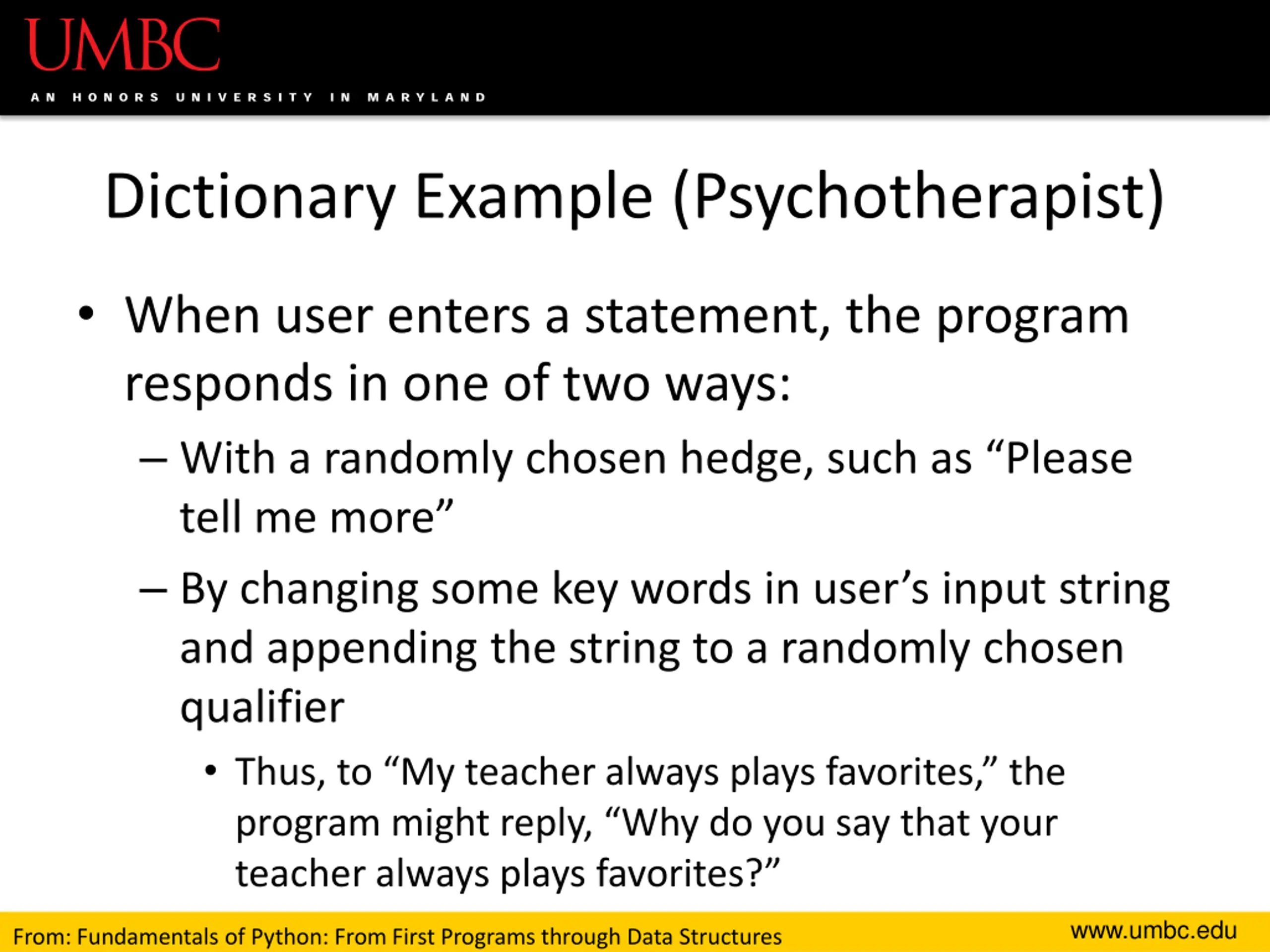 Dictionary Example (Psychotherapist) When user enters a statement, the program responds in one of two ways: With a randomly chosen hedge, such as Please tell me more By changing some key words in user s input string and appending the string to a randomly chosen qualifier Thus, to My teacher always plays favorites, the program might reply, Why do you say that your teacher always plays favorites? www.umbc.edu From: Fundamentals of Python: From First Programs through Data Structures