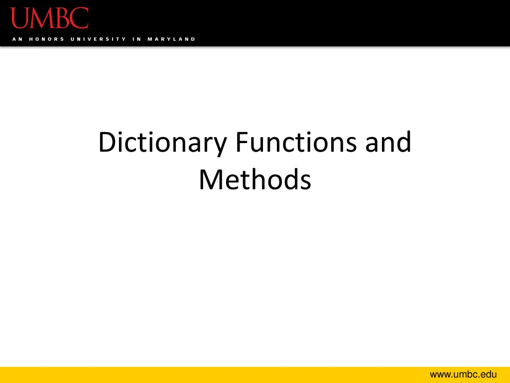 Functions len(dict) Gives the total length of the dictionary. This would be equal to the number of items in the dictionary. str(dict) Produces a printable string representation of a dictionary type(variable) Returns the type of the passed variable. If passed variable is dictionary, then it would return a dictionary type. www.umbc.edu From: http://www.tutorialspoint.com/python/python_dictionary.htm