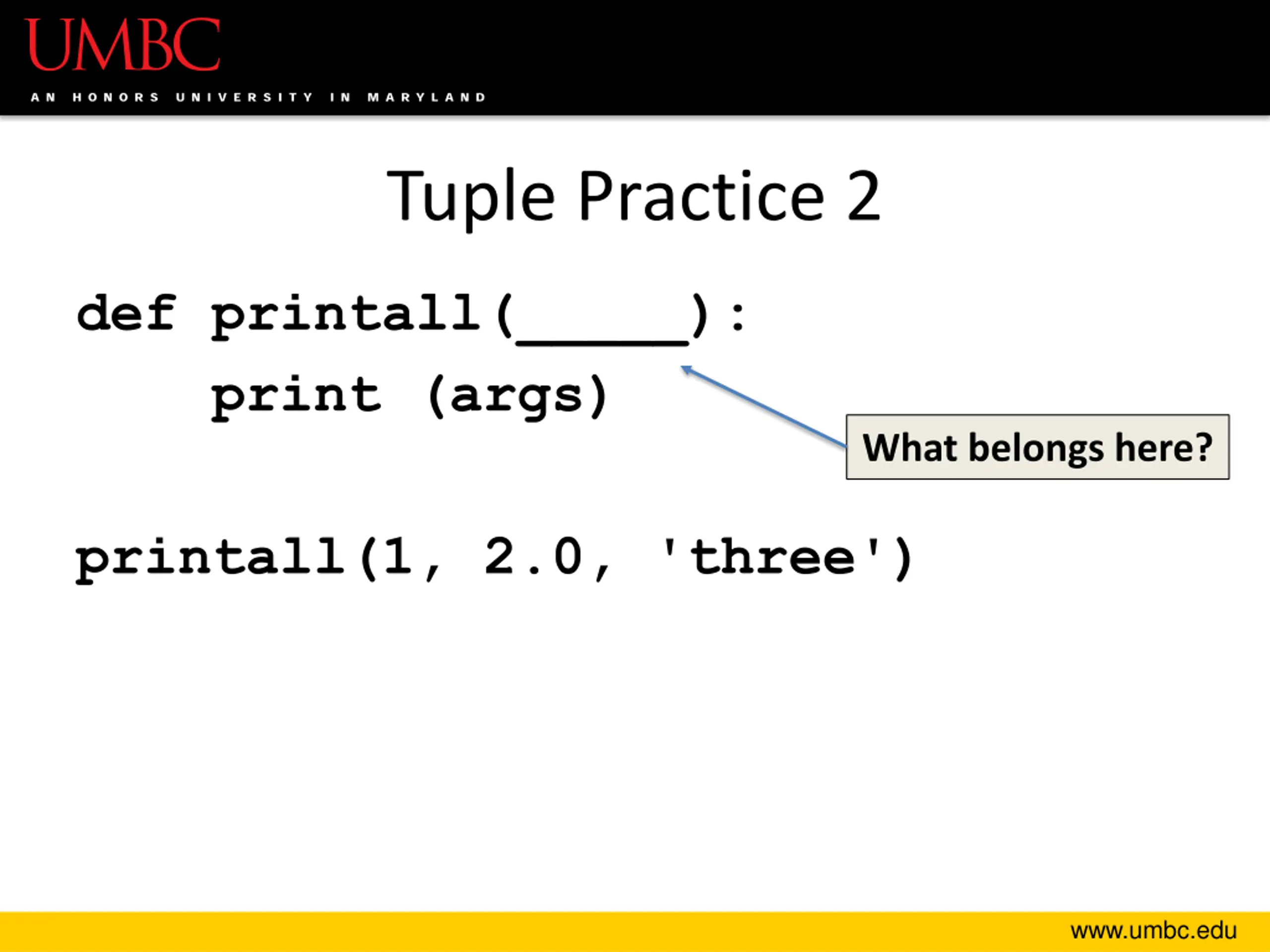 Tuple Practice 2 def printall(_____): print (args) What belongs here? printall(1, 2.0, 'three') www.umbc.edu