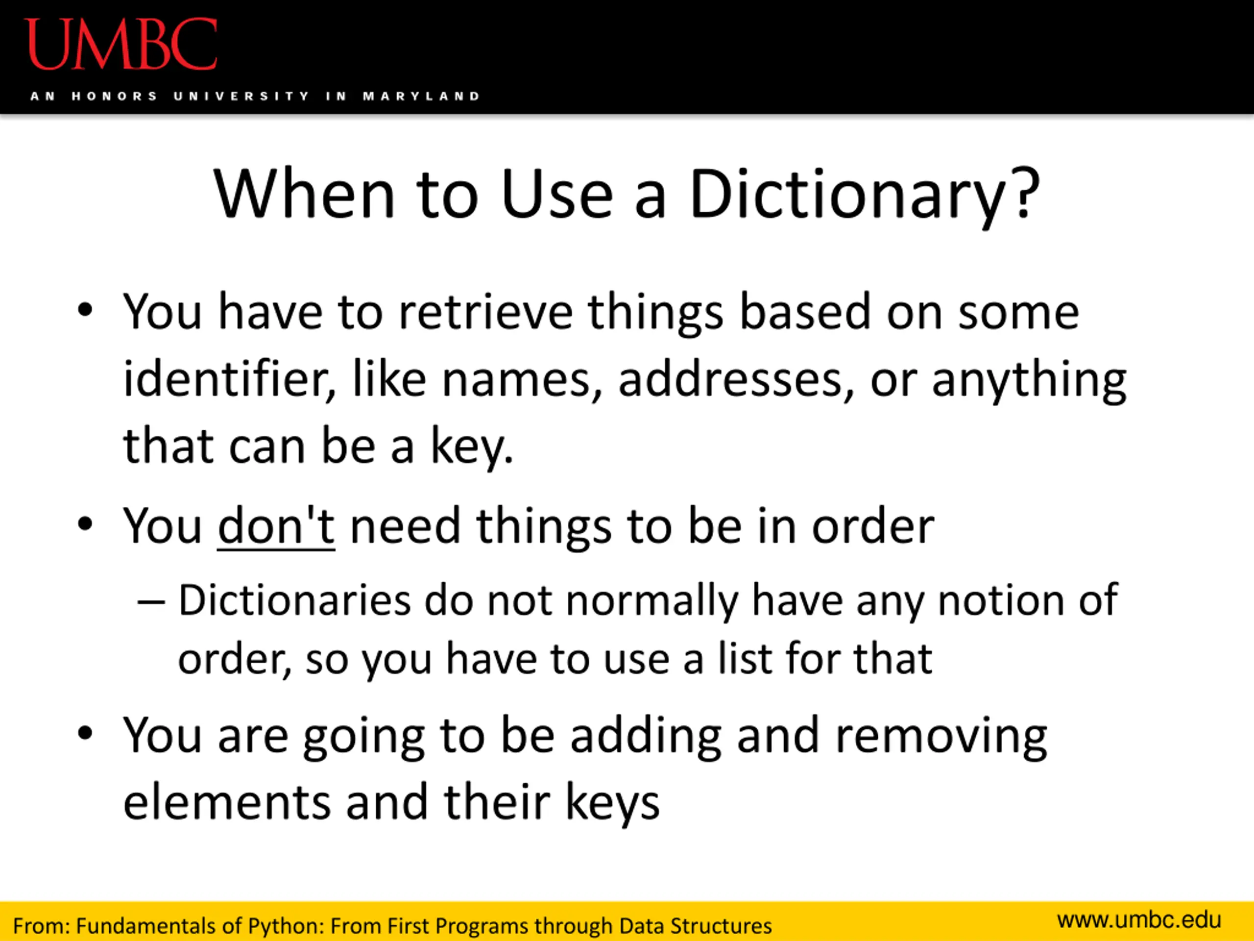 When to Use a Dictionary? You have to retrieve things based on some identifier, like names, addresses, or anything that can be a key. You don't need things to be in order Dictionaries do not normally have any notion of order, so you have to use a list for that You are going to be adding and removing elements and their keys www.umbc.edu From: Fundamentals of Python: From First Programs through Data Structures