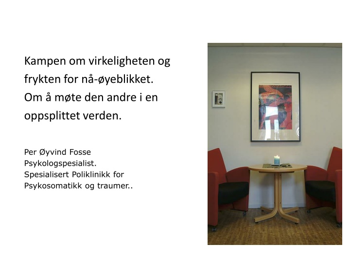 Kampen om virkeligheten og frykten for n - yeblikket. Om m te den andre i en oppsplittet verden. Per yvind Fosse Psykologspesialist. Spesialisert Poliklinikk for Psykosomatikk og traumer..