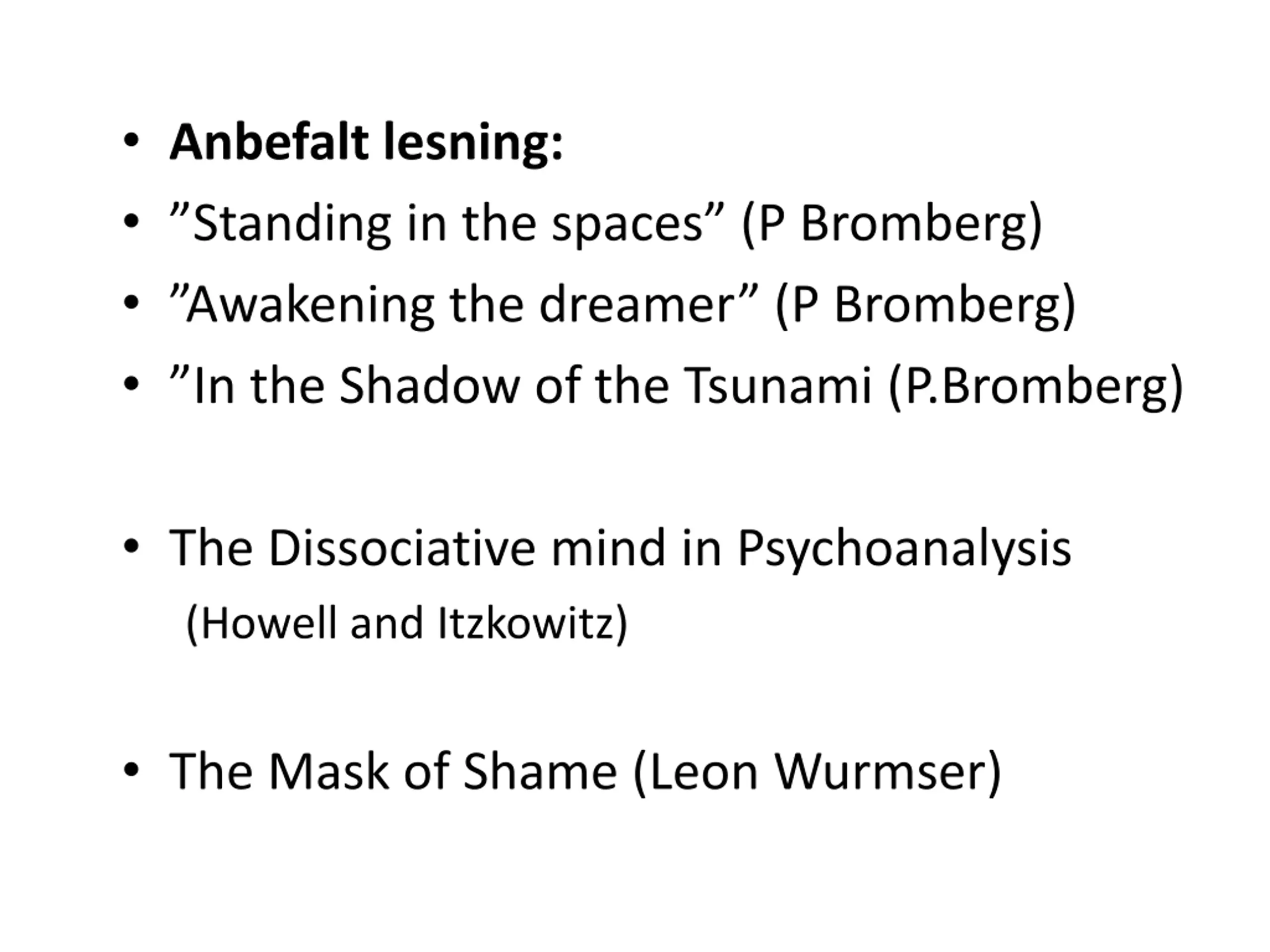 Anbefalt lesning: Standing in the spaces (P Bromberg) Awakening the dreamer (P Bromberg) In the Shadow of the Tsunami (P.Bromberg) The Dissociative mind in Psychoanalysis (Howell and Itzkowitz) The Mask of Shame (Leon Wurmser)