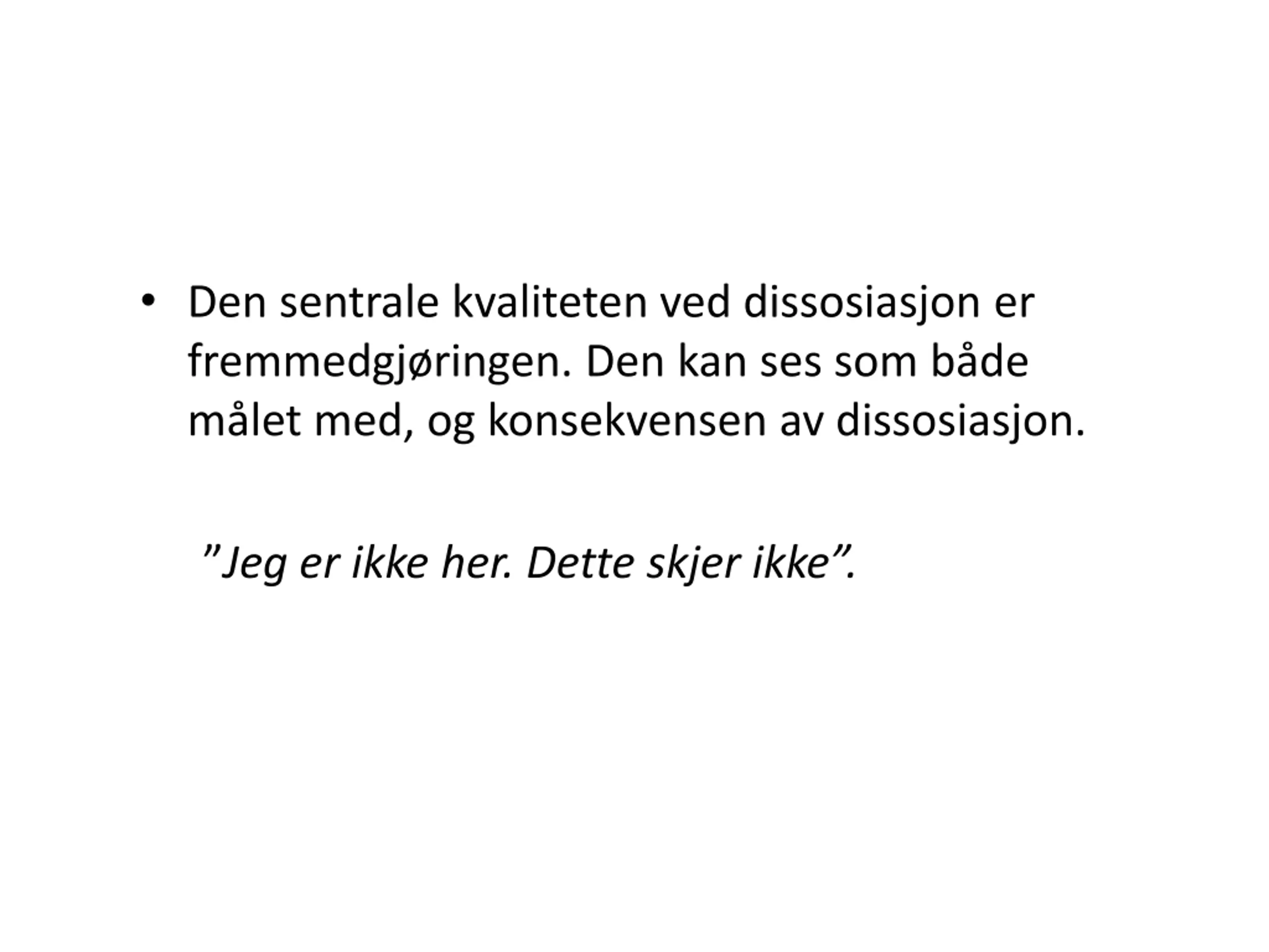 Den sentrale kvaliteten ved dissosiasjon er fremmedgj ringen. Den kan ses som b de m let med, og konsekvensen av dissosiasjon. Jeg er ikke her. Dette skjer ikke .