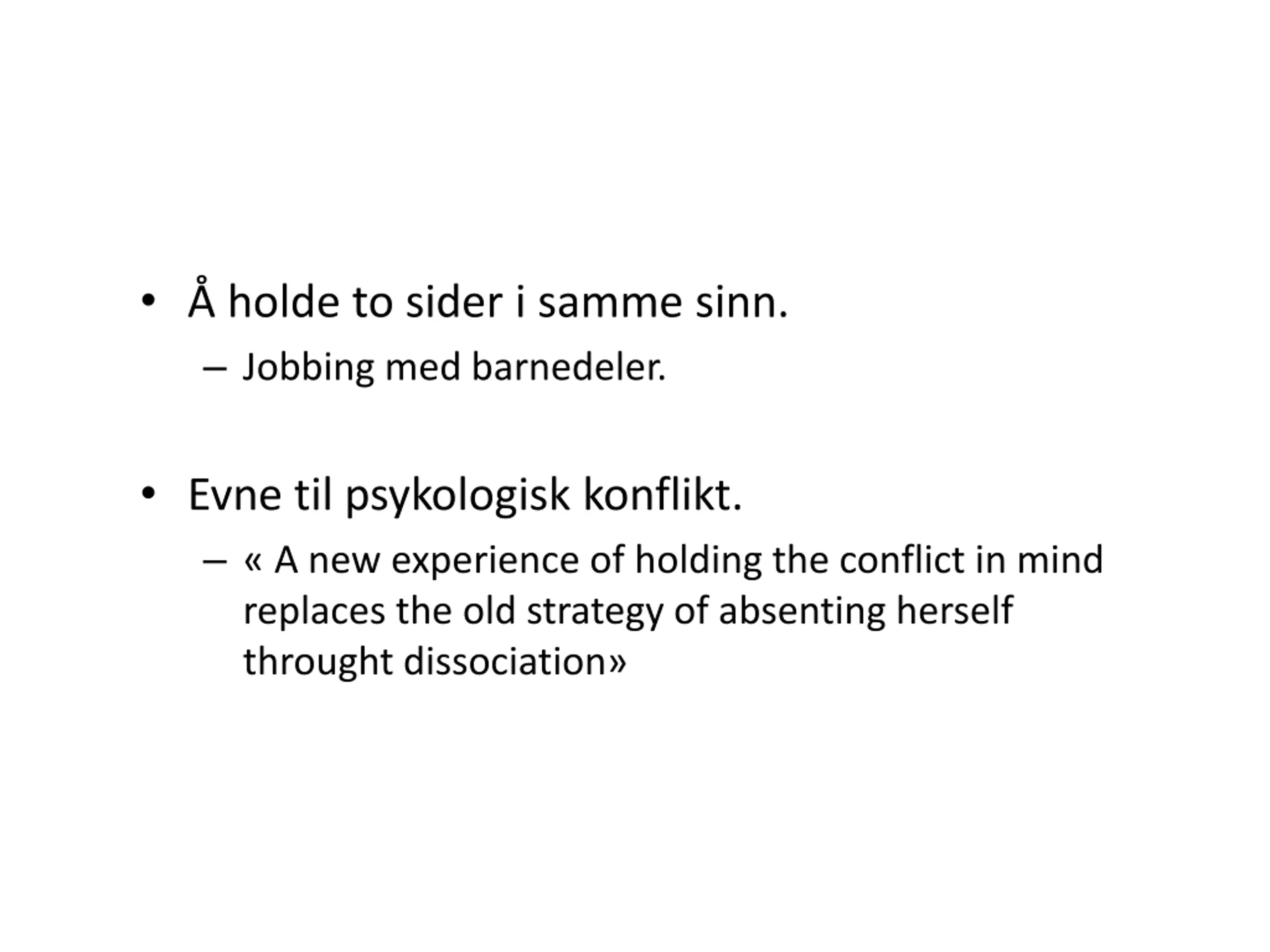 holde to sider i samme sinn. Jobbing med barnedeler. Evne til psykologisk konflikt. A new experience of holding the conflict in mind replaces the old strategy of absenting herself throught dissociation
