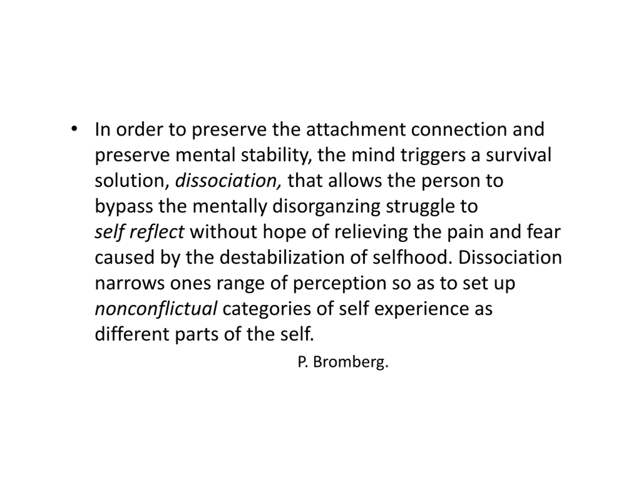 In order to preserve the attachment connection and preserve mental stability, the mind triggers a survival solution, dissociation, that allows the person to bypass the mentally disorganzing struggle to self reflect without hope of relieving the pain and fear caused by the destabilization of selfhood. Dissociation narrows ones range of perception so as to set up nonconflictual categories of self experience as different parts of the self. P. Bromberg.