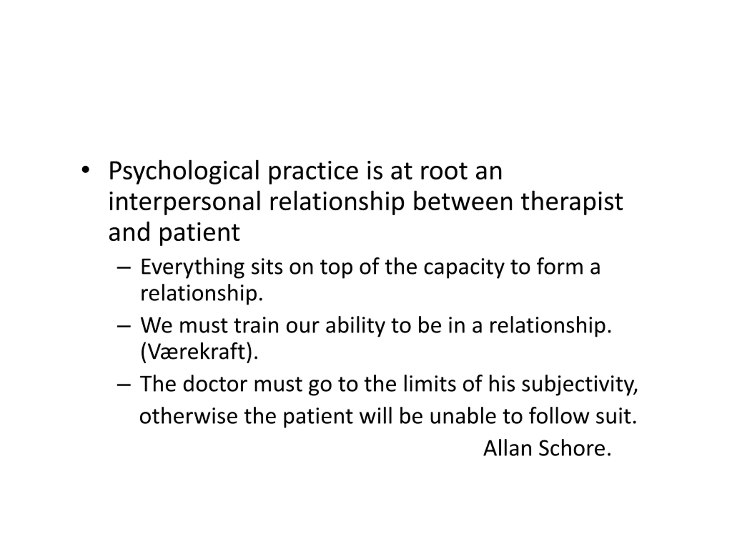 Psychological practice is at root an interpersonal relationship between therapist and patient Everything sits on top of the capacity to form a relationship. We must train our ability to be in a relationship. (V rekraft). The doctor must go to the limits of his subjectivity, otherwise the patient will be unable to follow suit. Allan Schore.