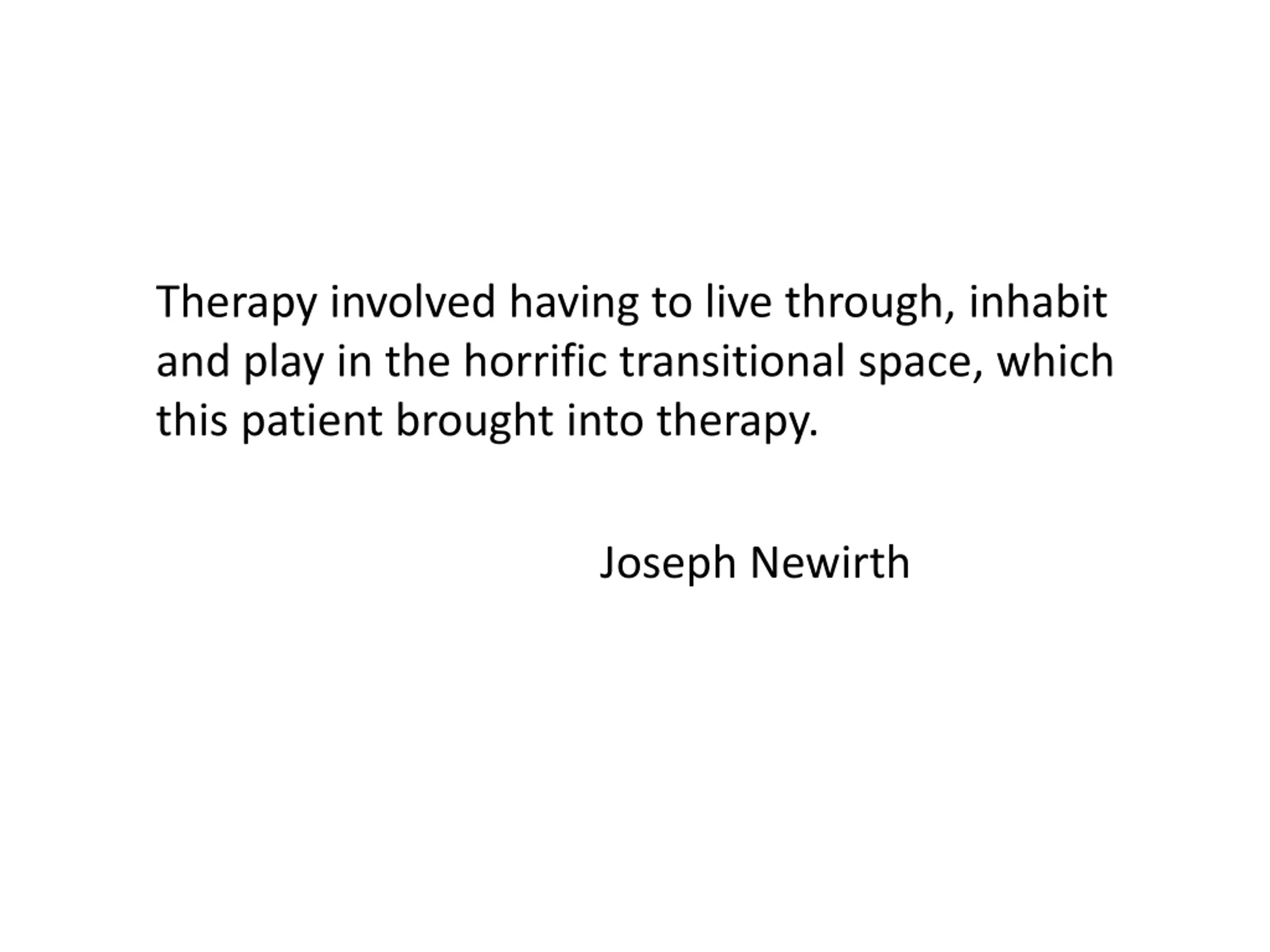 Therapy involved having to live through, inhabit and play in the horrific transitional space, which this patient brought into therapy. Joseph Newirth