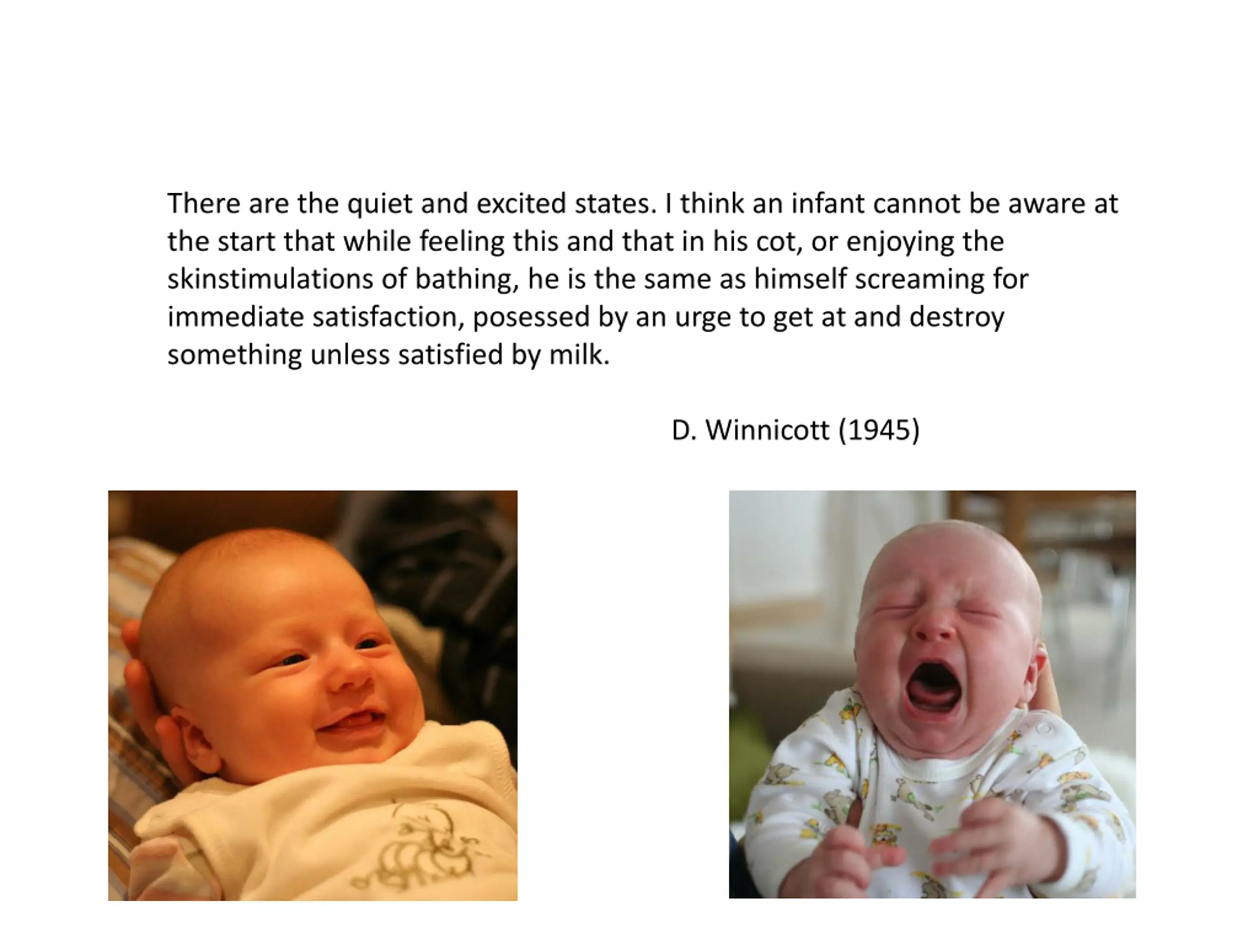There are the quiet and excited states. I think an infant cannot be aware at the start that while feeling this and that in his cot, or enjoying the skinstimulations of bathing, he is the same as himself screaming for immediate satisfaction, posessed by an urge to get at and destroy something unless satisfied by milk. D. Winnicott (1945)