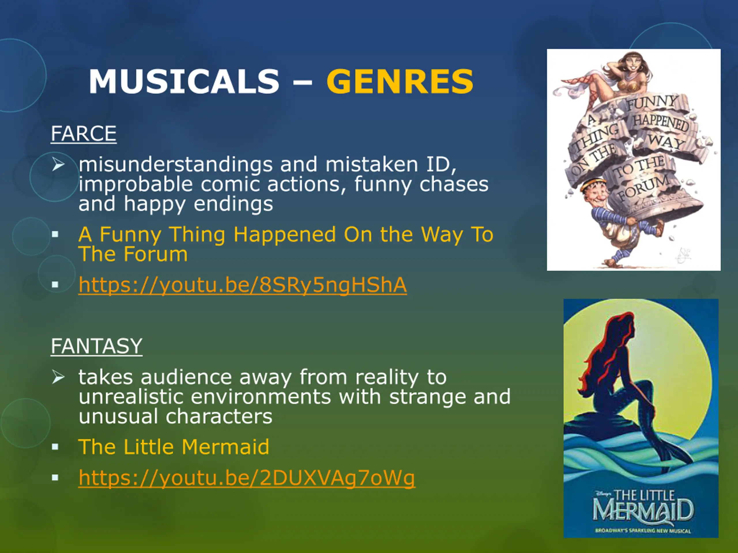 MUSICALS GENRES FARCE misunderstandings and mistaken ID, improbable comic actions, funny chases and happy endings A Funny Thing Happened On the Way To The Forum https://youtu.be/8SRy5ngHShA FANTASY takes audience away from reality to unrealistic environments with strange and unusual characters The Little Mermaid https://youtu.be/2DUXVAg7oWg