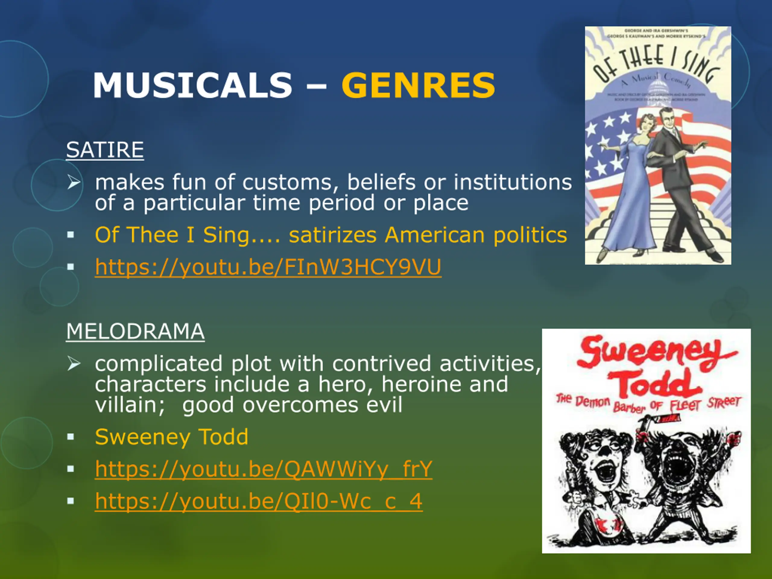 MUSICALS GENRES SATIRE makes fun of customs, beliefs or institutions of a particular time period or place Of Thee I Sing.... satirizes American politics https://youtu.be/FInW3HCY9VU MELODRAMA complicated plot with contrived activities, characters include a hero, heroine and villain; good overcomes evil Sweeney Todd https://youtu.be/QAWWiYy_frY https://youtu.be/QIl0-Wc_c_4