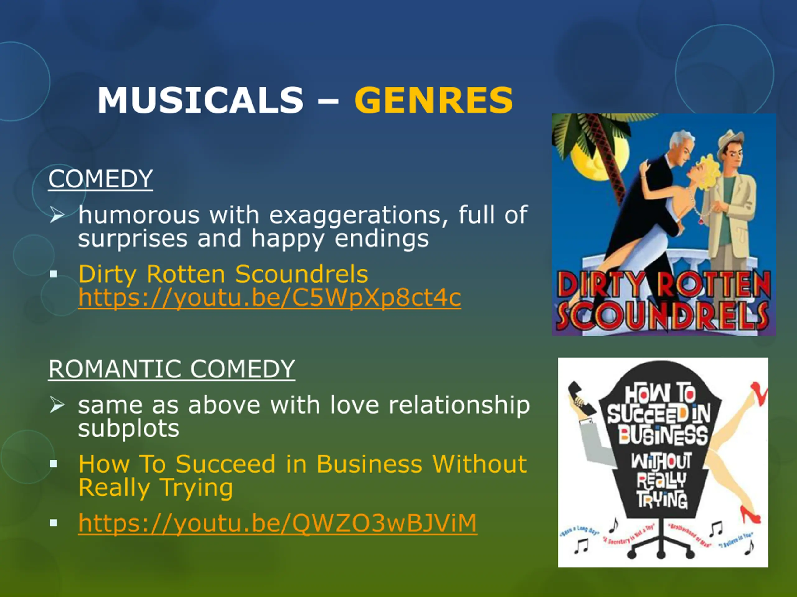 MUSICALS GENRES COMEDY humorous with exaggerations, full of surprises and happy endings Dirty Rotten Scoundrels https://youtu.be/C5WpXp8ct4c ROMANTIC COMEDY same as above with love relationship subplots How To Succeed in Business Without Really Trying https://youtu.be/QWZO3wBJViM